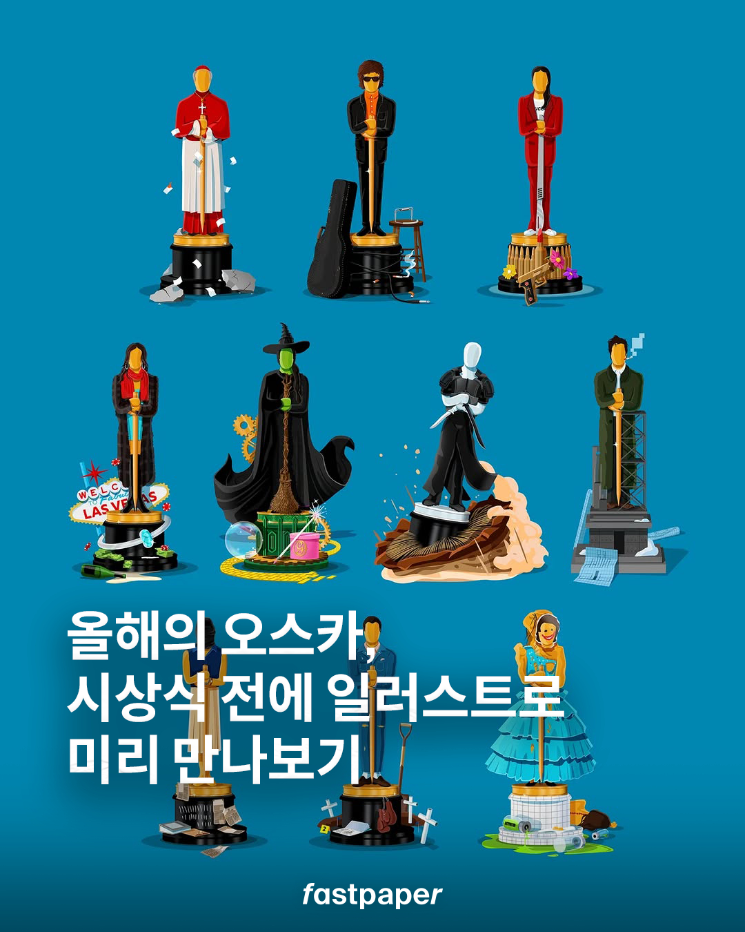 이번 일러스트에는 2025년 아카데미 작품상 후보작 10편이 담겼어요. 각 영화의 상징적인 요소가 트로피 실루엣 안에 절묘하게 녹아들어 한눈에 봐도 인상적인 디자인이 완성되었습니다. 과연 올해 오스카 작품상 트로피는 어느 작품이 차지할까요?