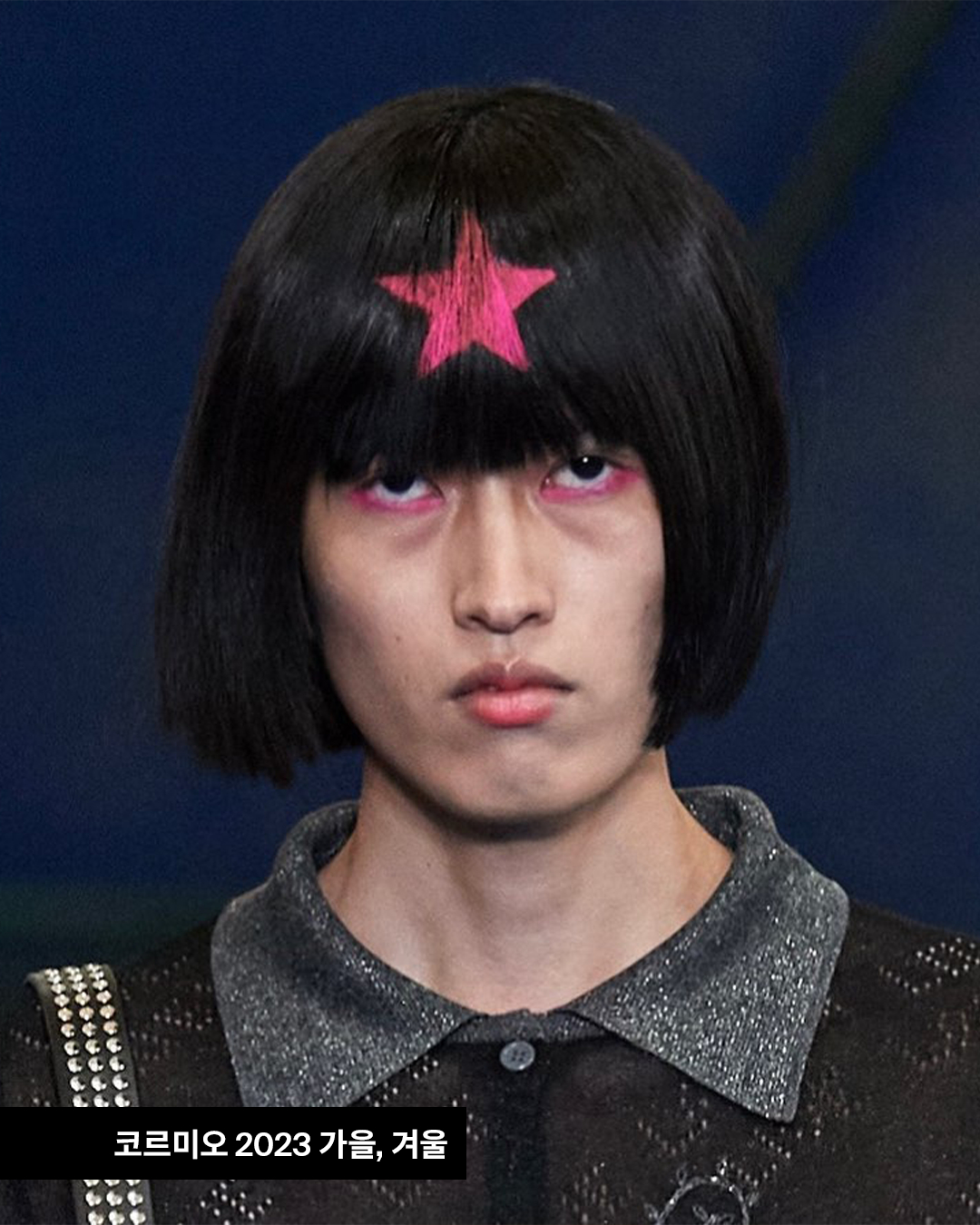 그녀의 리본 헤어는 헤어 아티스트 아야 쿠라오카의 작품! 아야 쿠라오카는 평소 리본이나 별 등 모티프를 활용해 창의적인 헤어 스타일을 선보입니다. 코르미오의 2023 가을, 겨울 패션쇼에 등장한 헤어들도 그녀의 손길이 닿은 작업물들입니다. 이 또한 트리 맨 꼭대기에 달린 별을 머리에 새겨버린 느낌이 나죠.