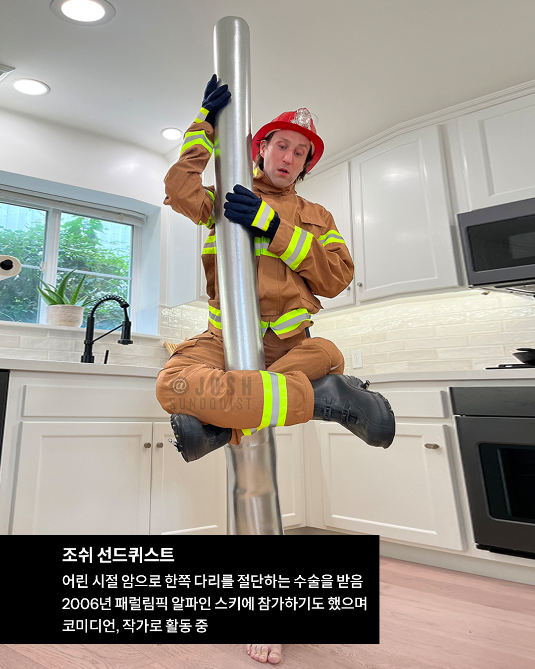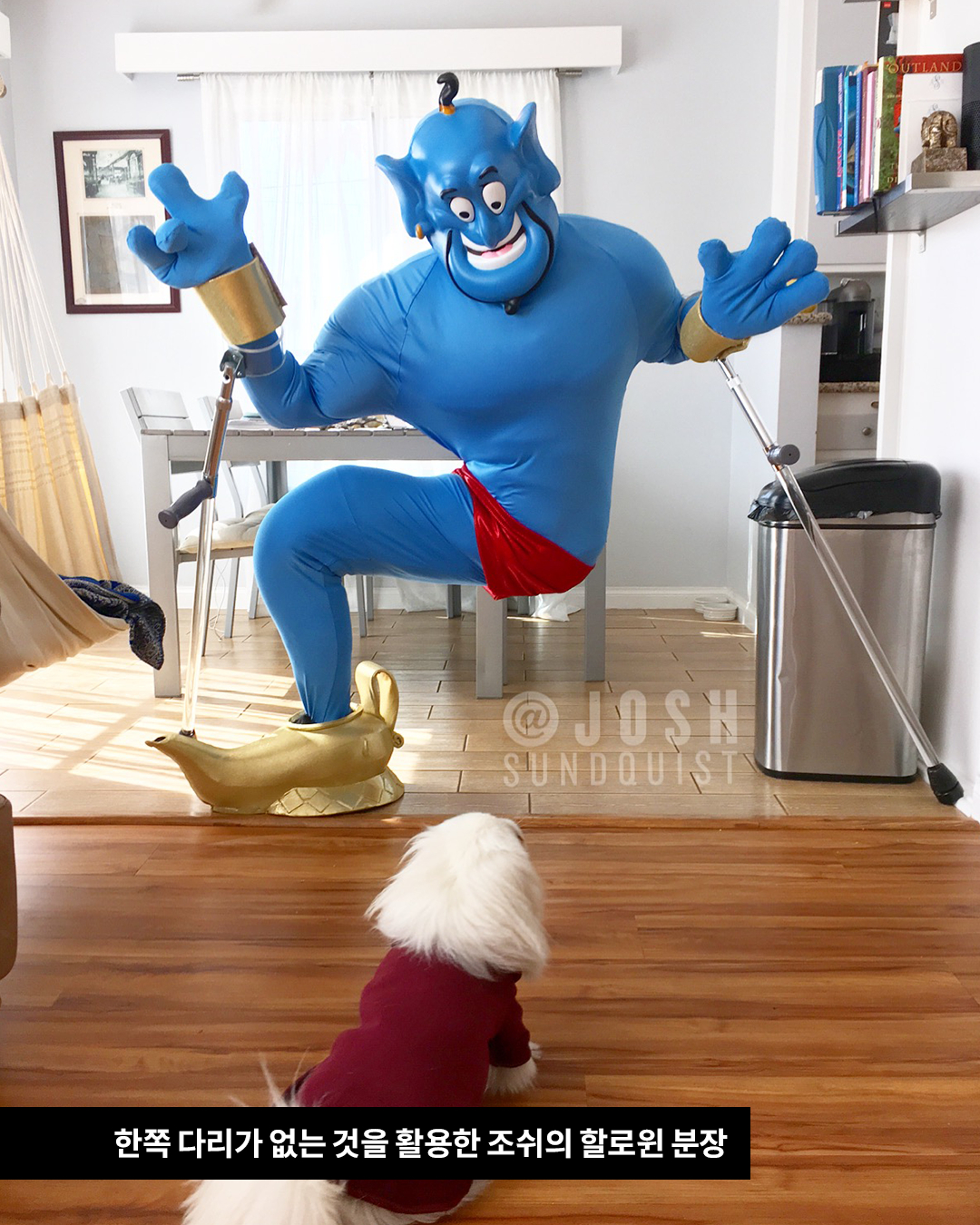 미국의 패럴림픽 출전 선수이자 코미디언인 조쉬는 어린 시절 암으로 한쪽 다리를 절단하는 큰 수술을 받게 됩니다. 한쪽 다리가 없는 장애에도 조쉬는 긍정적인 힘을 잃지 않았죠. 조쉬는 2010년부터 한쪽 다리가 없는 것을 이용한 할로윈 코스튬을 입기 시작합니다.