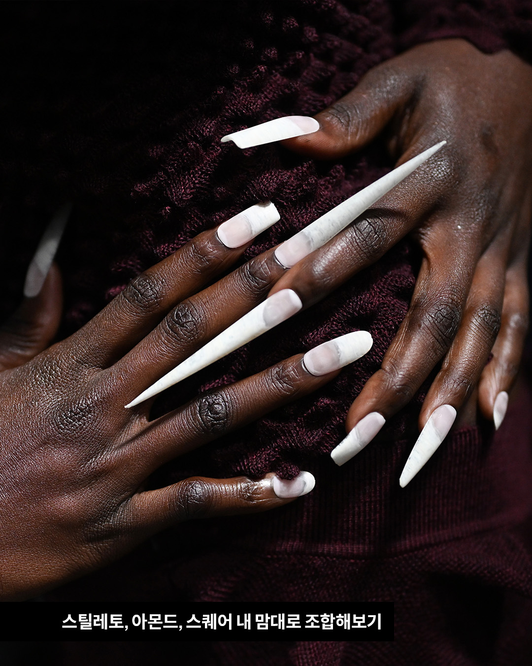 쳇 로의 모델들은 손가락 각각 모양이 다른 네일 아트를 했어요. 그러고 보니, 네일 아트 받을 때 손톱 모양을 통일할 필요 없잖아요? 검지 손톱은 스틸레토, 엄지 손톱은 스퀘어, 나머지 손톱은 아몬드. 이렇게 마음대로 조합해 보는 거 어때요?