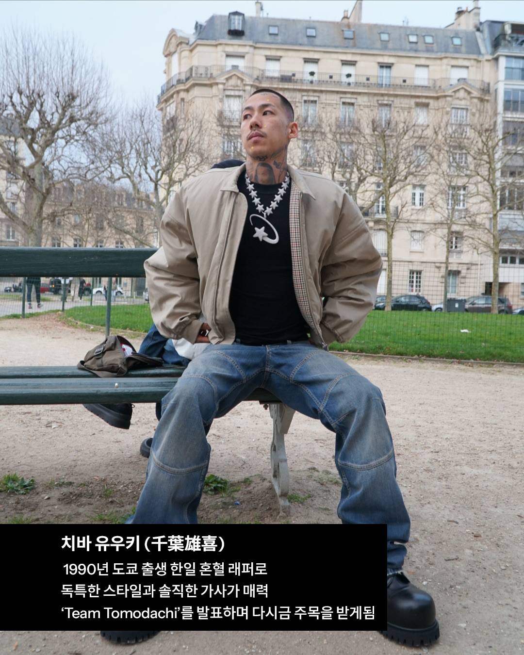 패페 에디터 선정 아웃핏 1위 래퍼 치바 유우키, 이전에는 KOHH라는 예명으로 활동했으나 본명인 치바 유우키로 활동명을 변경했으며, 2024년 2월 새 싱글 ’Team Tomodachi‘를 발표하며 전 세계적인 ‘팀 토모다치’ 열풍을 일으켰죠. 메건 디 스탤리언과 함께 발매한 ‘Mamushi’라는 곡도 큰 사랑을 받았습니다.