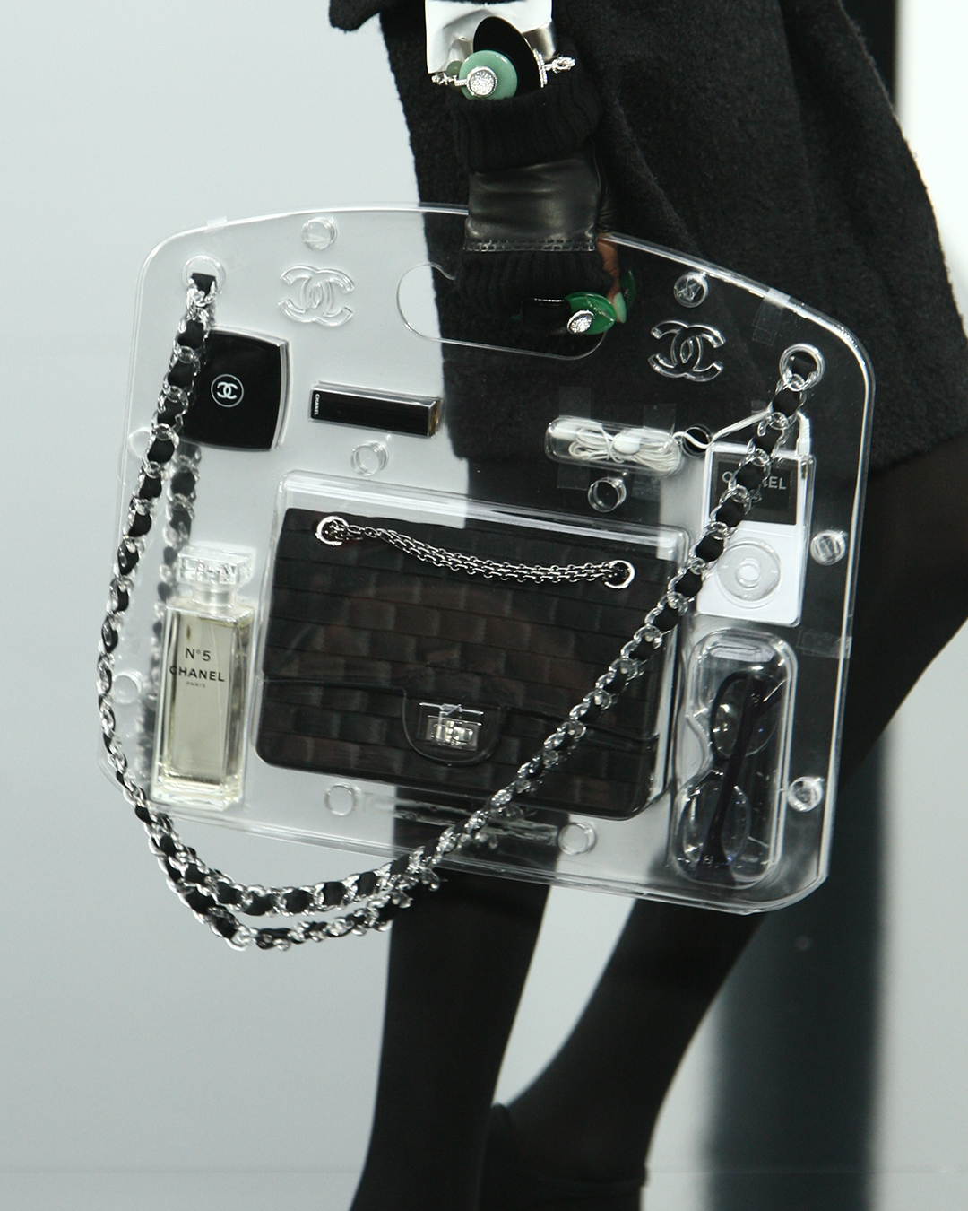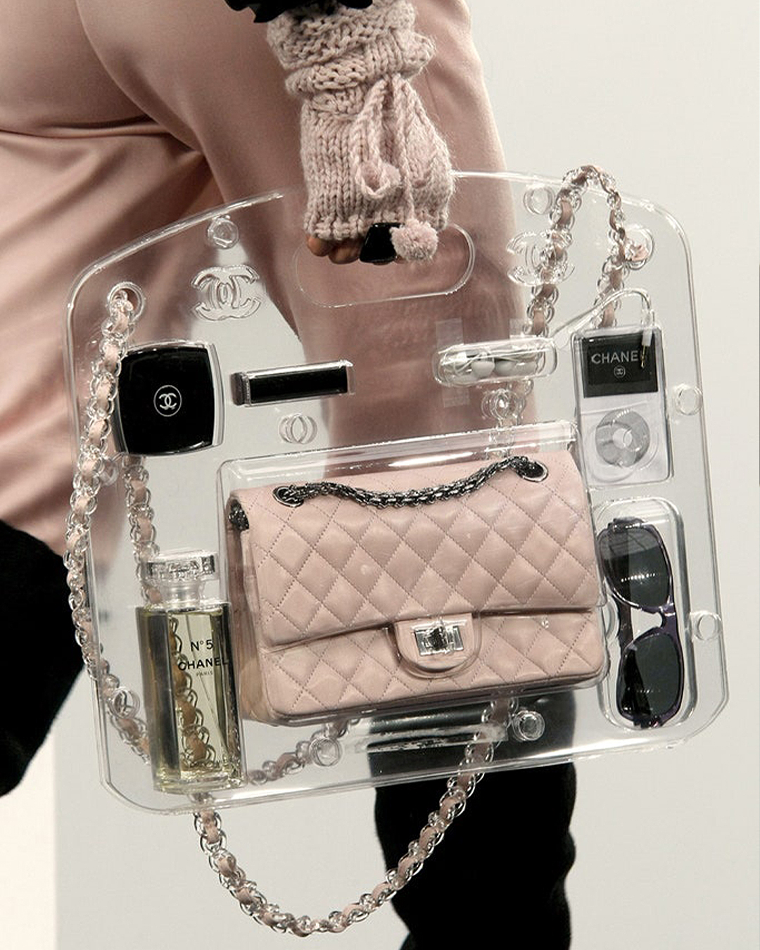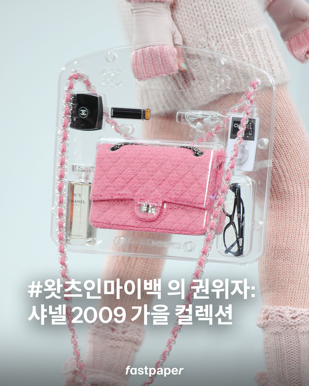 투명한 샤넬 캐리올 안에 샤넬의 시그니처 핸드백은 물론 립스틱과 블러셔, 선글라스 등의 아이템들이, 마치 원래 하나의 세트로 존재하는 것처럼 정갈하게 나열돼 있어요. 이 모습은 요즘 딱 유행하는 ‘왓츠인마이백’의 콘텐츠 촬영 앵글을 연상케 하죠. 가방 속에 담긴 물건을 꺼내 보여주는 왓츠인마이백을 논할 때, 샤넬 2009 가을 컬렉션 런웨이를 절대 빼놓으면 안 되겠죠?