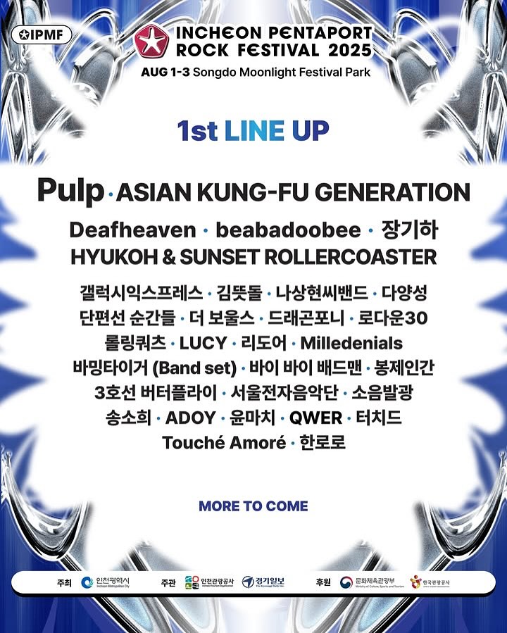 펄프 무대를 한국에서 볼 수 있다니, 펜타포트는 다 됩니다. 8월 1일부터 3일까지 송도 달빛공원에서 열리는 2025 펜타포트 1차 라인업이 공개됐습니다. 커리어 최초, 한국 무대에 오르는 브릿팝의 전설인 펄프가 헤드라이너로 이름을 올렸는데요. 외에도 아시안 쿵푸 제너레이션, 비바두비, 혁오 & 선셋 롤러코스터, 바밍 타이거 등 한국과 글로벌에서 모두 사랑 받는 아티스트 라인업을 자랑하죠.