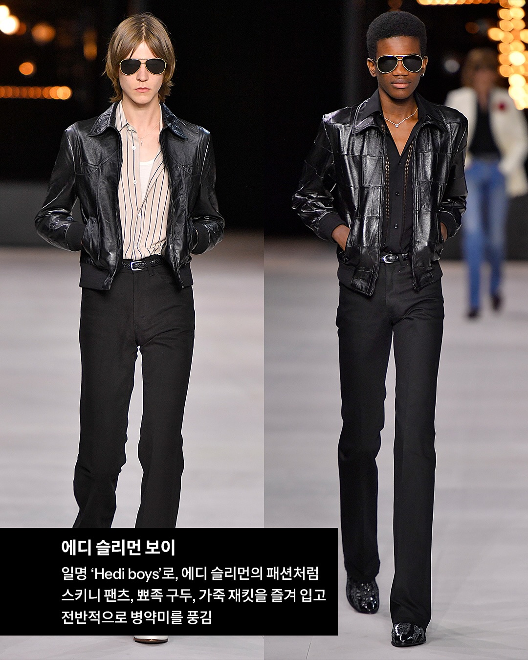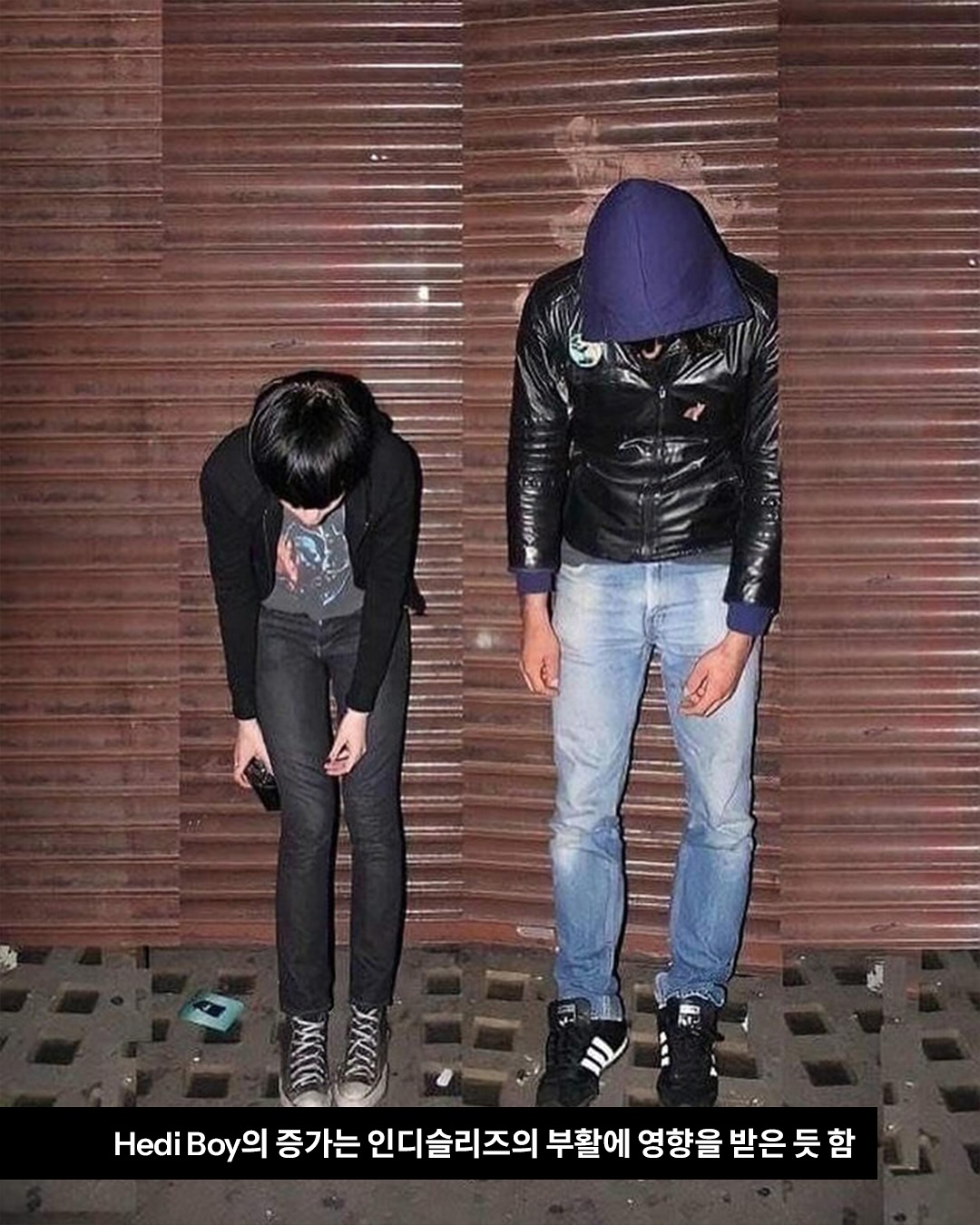 스키니 팬츠, 뾰족 구두, 가죽 재킷, 그리고 퀭한 병약미. 에디 슬리먼 보이, 일명 ‘Hedi boys’들이 최근들어 증가했다고 합니다. 이는 인디슬리즈 붐의 컴백과 함께 생각할 수 있을 것 같은데요, The Hellp, 2hollis 같은 뮤지션들이 이 에디 보이들의 증가에 영향을 주고 있죠. 이 에디 보이들은 담배 말고는 밥을 안 먹는지 핏한 몸을 가졌으며, 새벽 내내 파티를 즐긴 듯한 덥수룩한 머리, 수염 자국이 특징입니다.