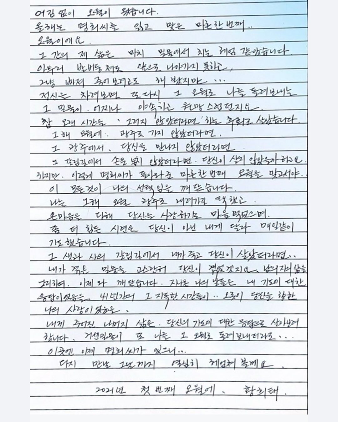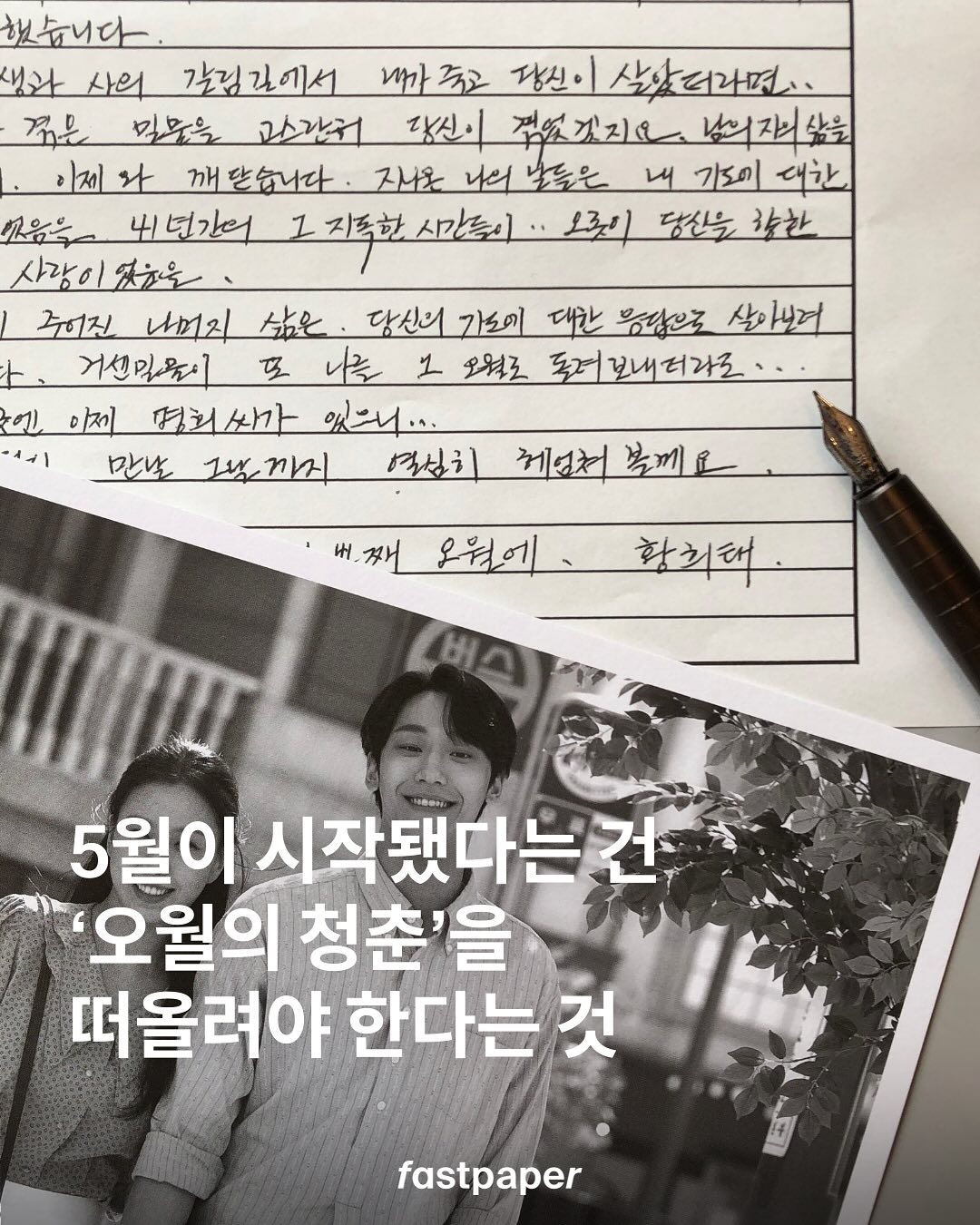 ‘오월의 청춘’은 1980년 5월, 역사의 소용돌이 한가운데 운명처럼 서로에게 빠져버린 희태와 명희 사이 아련한 사랑 이야기를 담은 드라마죠. 5월을 맞이하며 명희에게 쓴 희태의 편지는, 몇 번을 읽었음에도 불구하고 가슴이 아려옵니다.