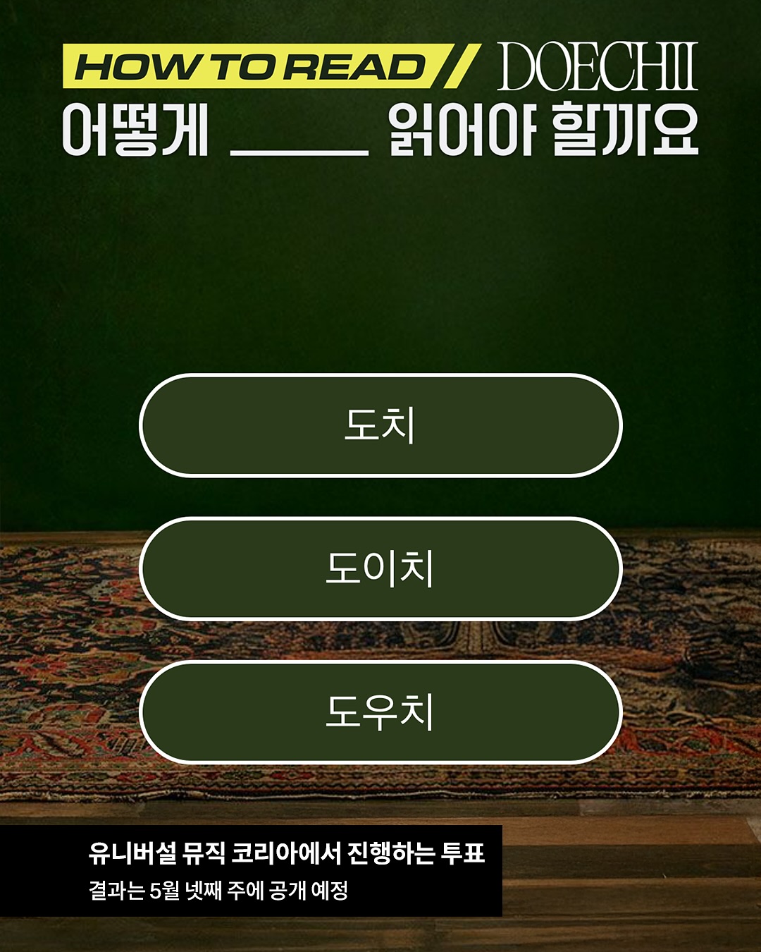 각자 다르게 쓰고 있던 Doechii 이름! 대국민 투표로 딱 정해봅시다. 투표는 유니버설 뮤직 코리아의 프로필 링크에서 참여할 수 있으며, 투표의 결과는 한달 뒤 5월 넷째 주에 공개 예정입니다.