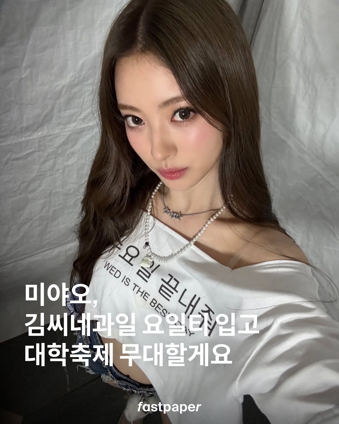 바로 어제 청주대학교의 축제를 축하하기 위해 무대에 오른 미야오! 수요일에 진행된 무대인만큼, 특별한 무대 의상으로 등장했는데요. 에스파 카리나, 에이티즈 최산 등 수많은 셀럽들이 착용했던 김씨네과일의 ‘요일티’가 그 주인공.