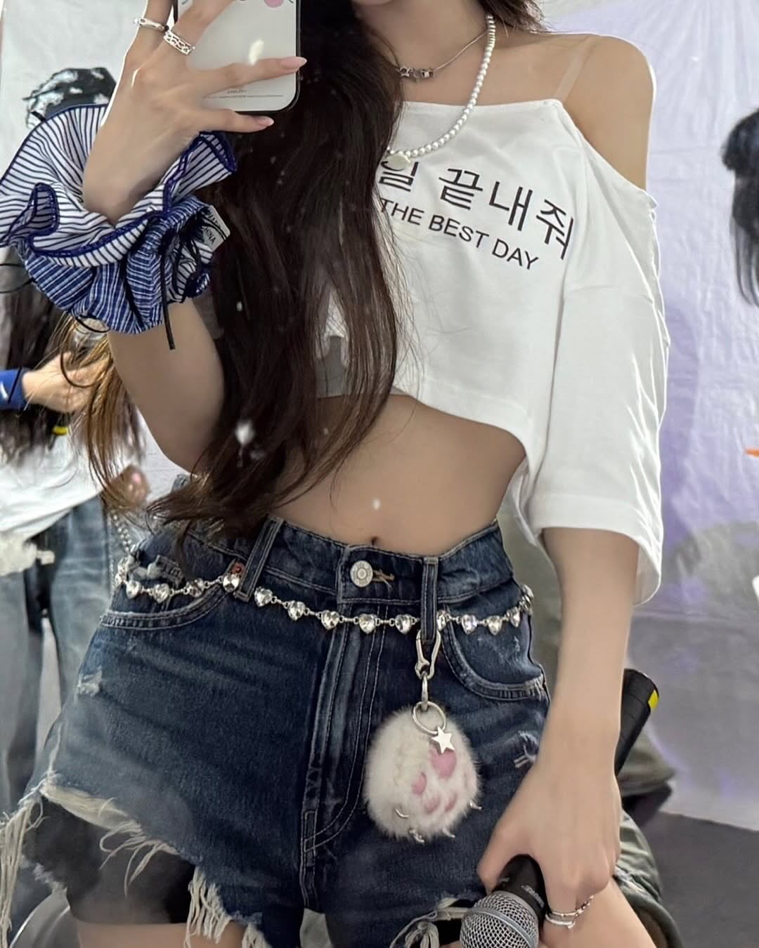 미야오의 안나는 ‘수요일 끝내줘’라는 문구가 새겨진 티셔츠를 크롭 톱으로 리폼해 무대 의상으로 활용했습니다. 나 이 티셔츠를 무대 위에서 볼 줄은 꿈에도 몰랐네…