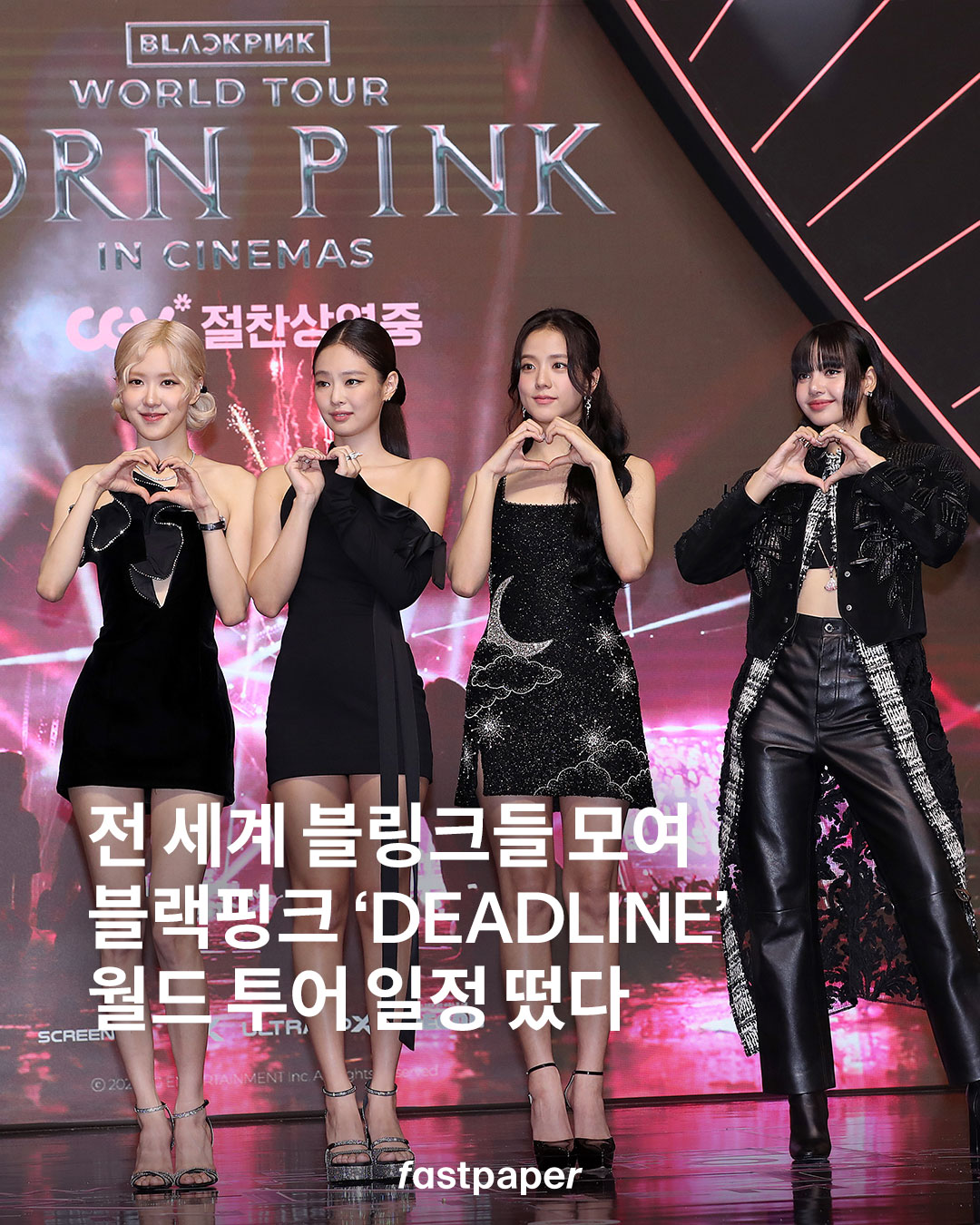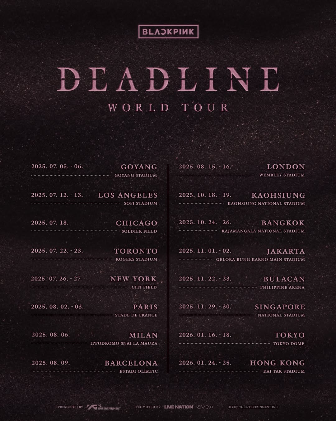 블랙핑크 완전체 커밍 쑨! YG가 다가오는 블랙핑크 월드 투어 일정을 발표했습니다. 제니, 로제, 지수, 리사는 오는 7월 5일과 6일, 양일간 고양에서의 공연을 시작으로 엘에이, 시카고, 토론토와 뉴욕, 유럽에서는 파리, 밀란, 바르셀로나, 런던에서 무대를 펼칠 예정. ‘DEADLINE’ 투어는 2026년 1월, 도쿄에 이어 홍콩에서 마무리 됩니다.