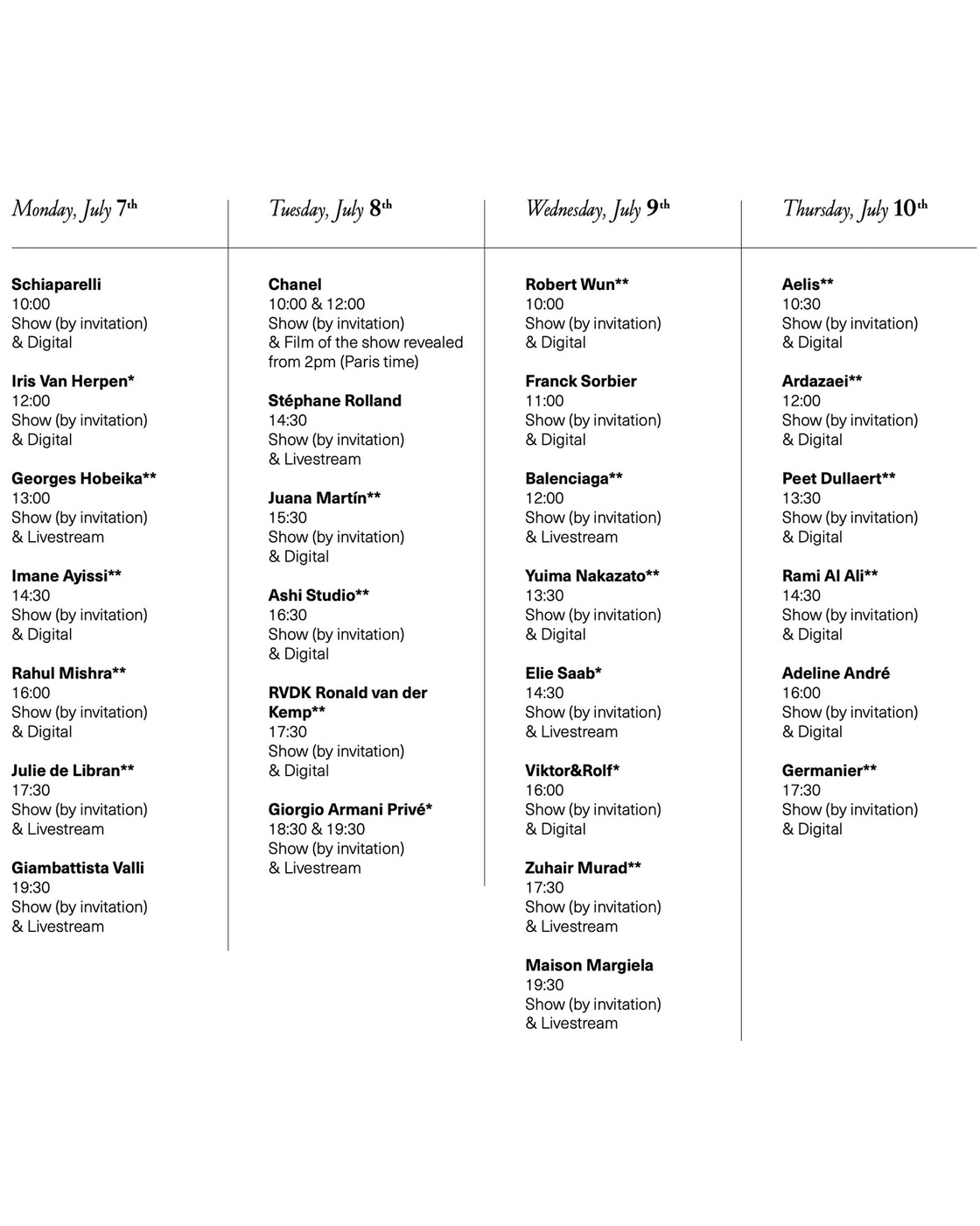 7월 8일에는 마티유 블라지가 합류하기 전, 샤넬 스튜디오 팀의 마지막 쇼가 예정되어 있으며, 3일차에는 뎀나의 마지막 발렌시아가 컬렉션이 공개됩니다. 또한 글렌 마틴스는 오트 쿠튀르 컬렉션으로 메종 마르지엘라 데뷔를 앞두고 있으며, 쿠튀르 주간의 피날레는 제르마니에가 맡습니다.