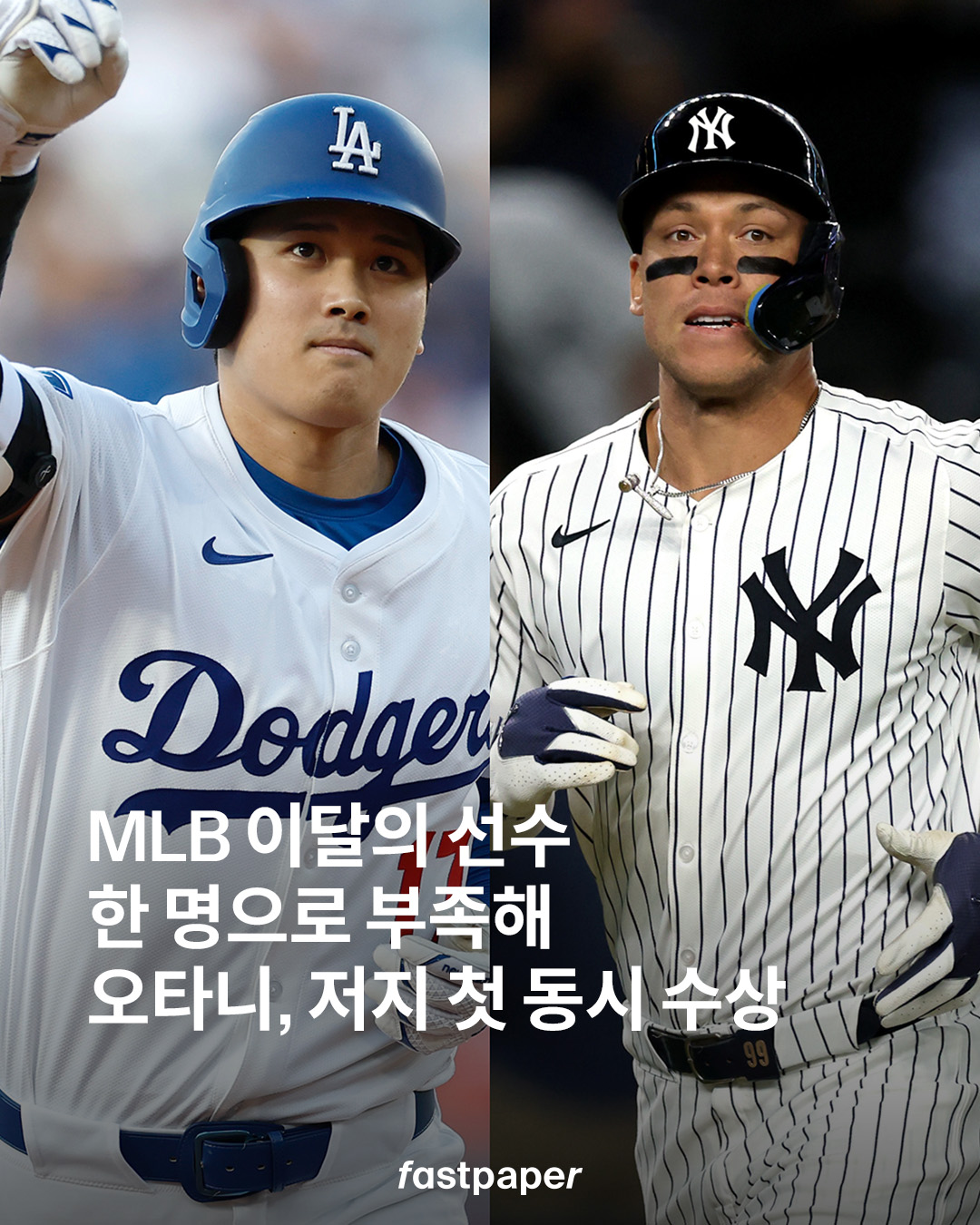 MLB를 대표하는 두 슈퍼스타, LA 다저스의 오타니 쇼헤이와 뉴욕 양키스의 에런 저지가 사상 처음으로 ‘이달의 선수’를 같은 달, 각 리그에서 동시에 수상했습니다! 두 선수가 이 상을 같은 시기에 받은 건 MLB 역사상 처음이에요.