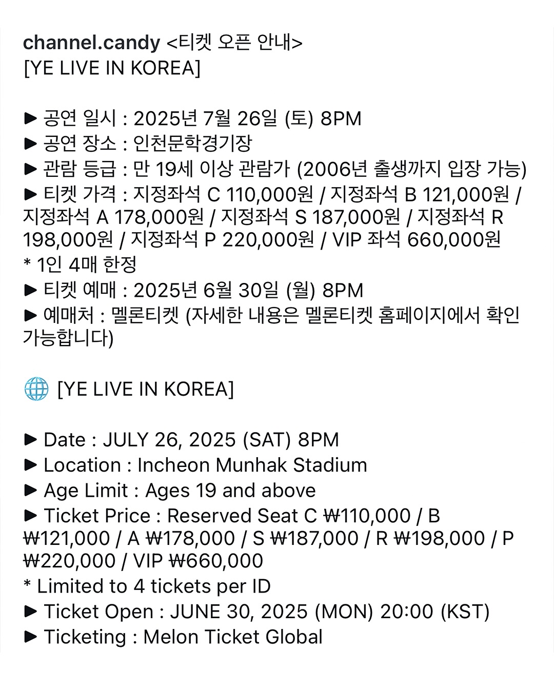 YE a.k.a. 칸예 웨스트의 내한 공연 티켓 정보가 공개되었습니다. 가장 중요한 티켓 가격은 좌석 등급에 따라 11만 원 부터 VIP 좌석 66만 원까지 안내되었는데요, 스탠딩 없이 전부 지정 좌석으로 공지되었습니다.