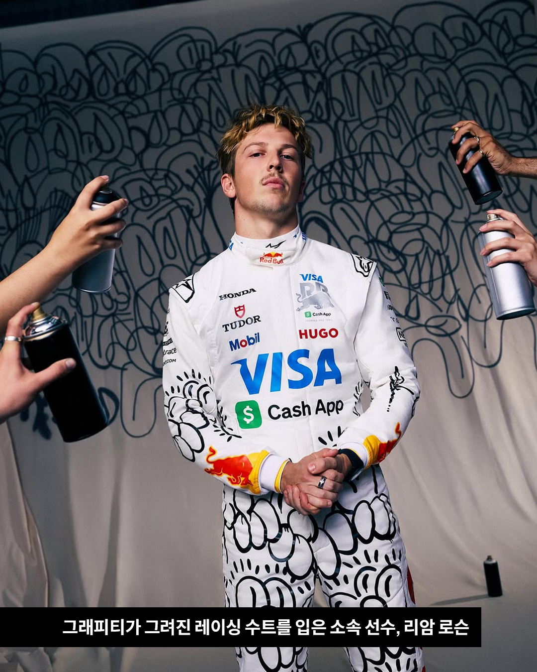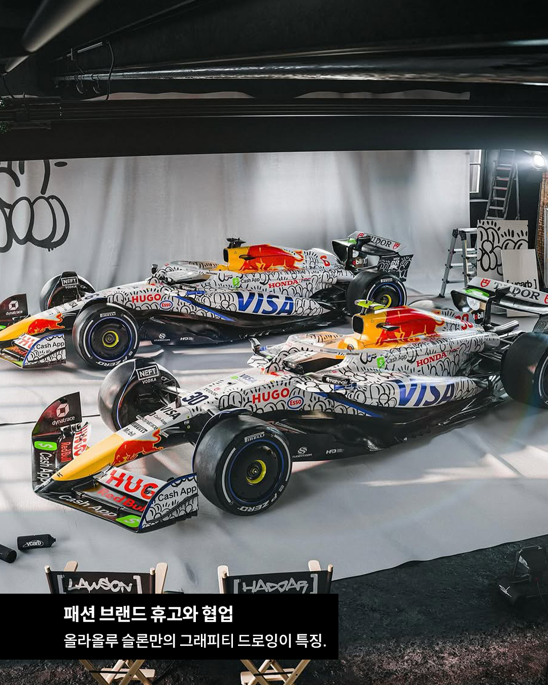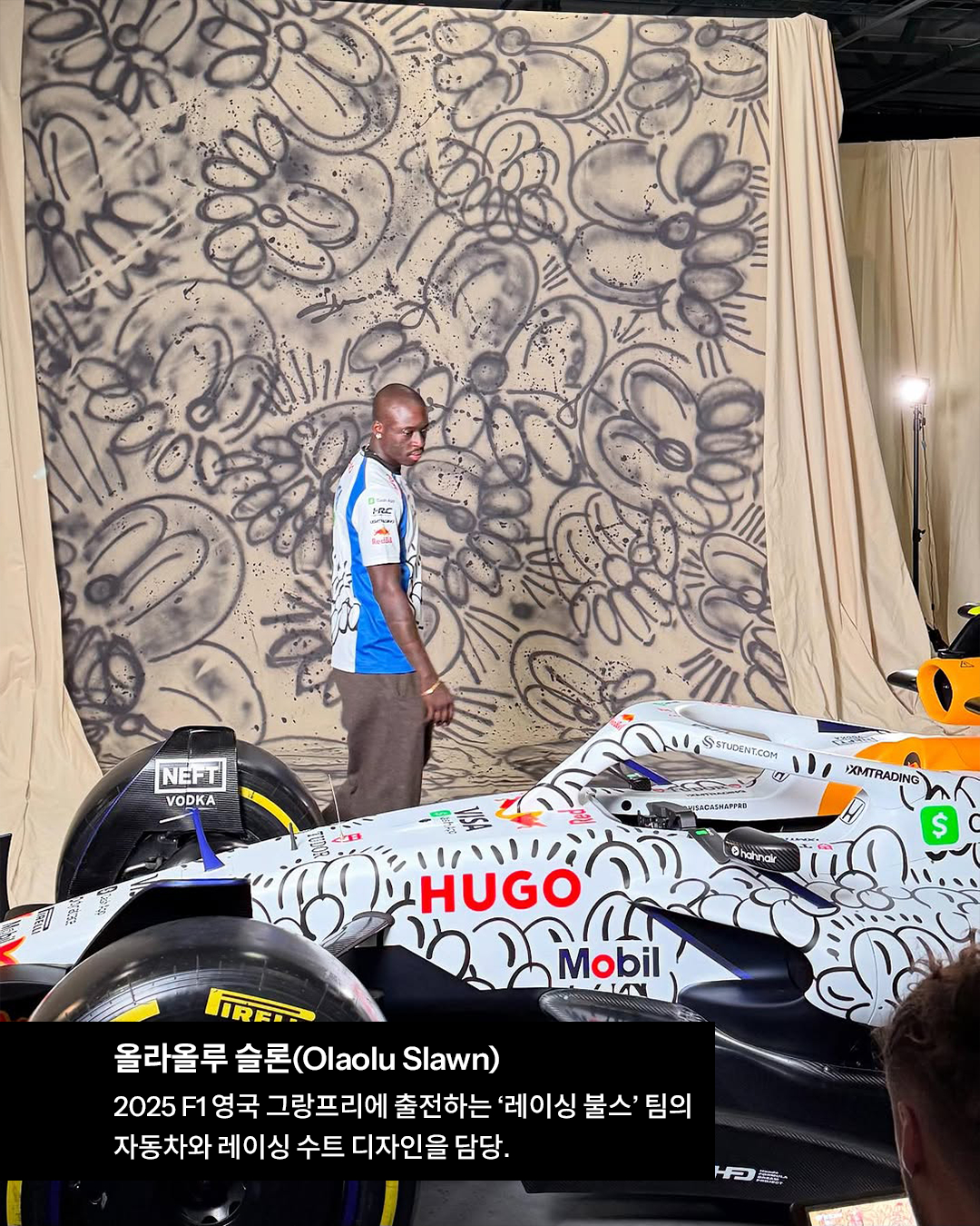 그는 2025 F1 그랑프리에 출전하는 레이싱 불스 팀을 위해 그림을 선사했습니다. 올라올루 슬론 특유의 활기차고 자유로운 드로잉 그래피티에, 패션 브랜드 휴고까지 합세했는데요. 생동감 넘치는 드로잉은 레이싱 불스 팀이 탑승할 자동차와 레이싱 수트에 특별함을 더했습니다.