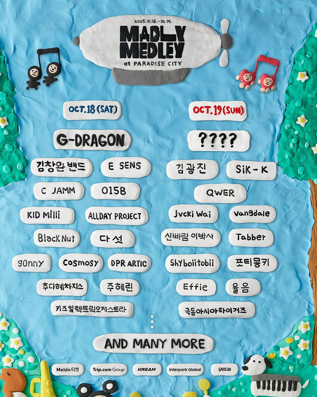 지디가 헤드라이너 아니면 누가 하냐. 아무래도 그렇긴 해 오는 10월 18일 토요일과 19일 일요일 양일간 인천 파라다이스 시티에서 개최되는 매들리 메들리 페스티벌! 김창완밴드, 이센스, 김광진 등 엄청난 라인업이 이미 공개되었는데요. 드디어 오늘 헤드라이너의 정체가 밝혀졌습니다.