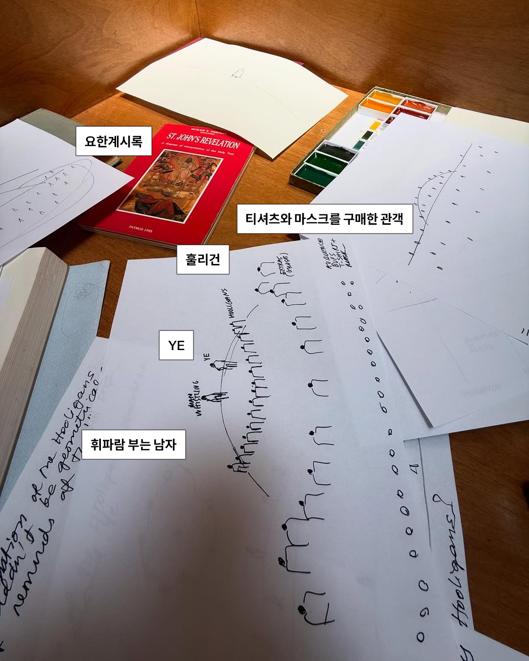 사진에서는 원형의 작은 산처럼 보이는 무대 세트와 요한계시록 책을 볼 수 있습니다. 요한계시록은 세상의 종말과 예수 재림의 내용을 담고 있는데요, 이 예수 재림의 모습이 회화에서 종종 천사에게 원형으로 둘러싸인 모습으로 표현됩니다. 스케치 속 원형으로 휘파람 부는 남자를 둘러싼 훌리건들의 모습이 이와 비슷하죠.
