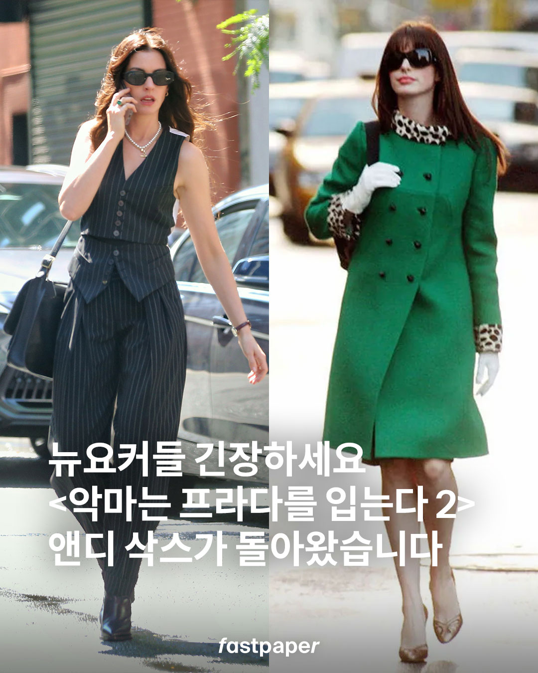 분명 19년이나 흘렀는데 왜 언니는 그대로인거야… <악마는 프라다를 입는다> 후속편 촬영 중인 앤 해서웨이의 모습이 공개되었습니다.