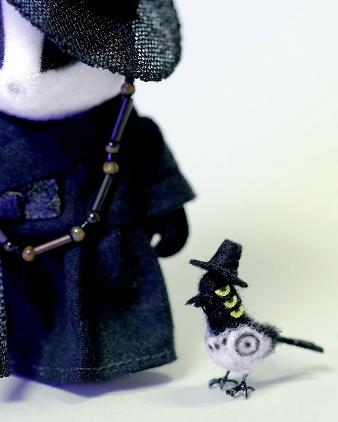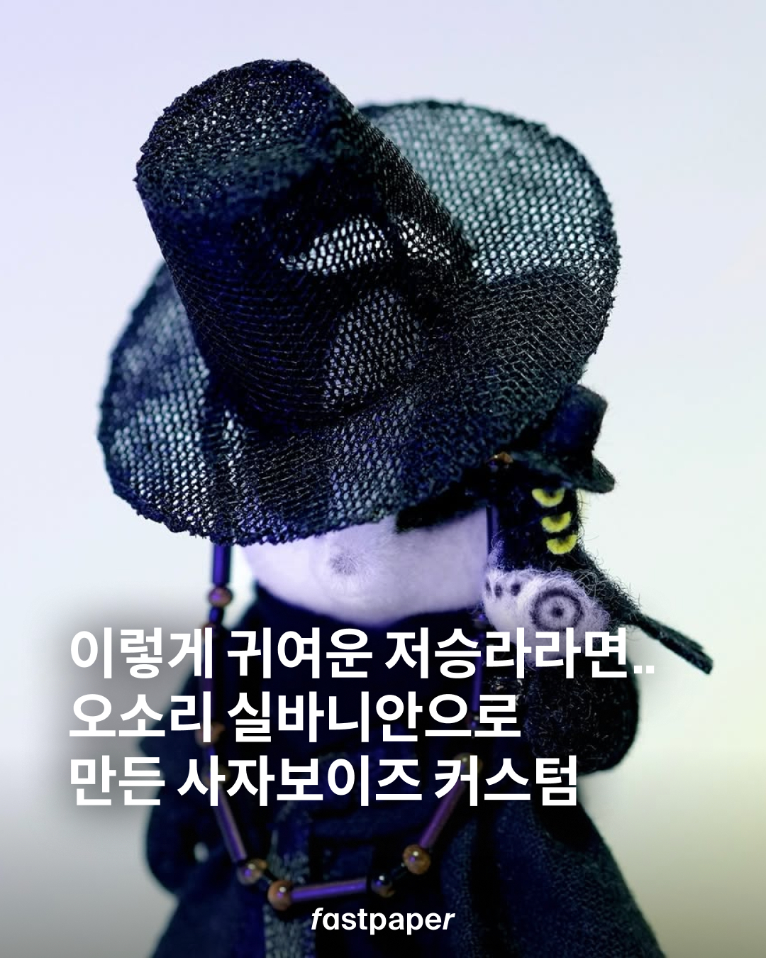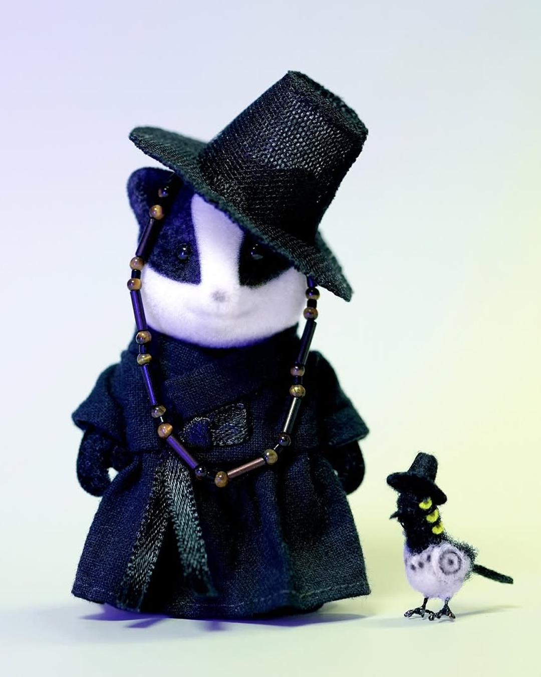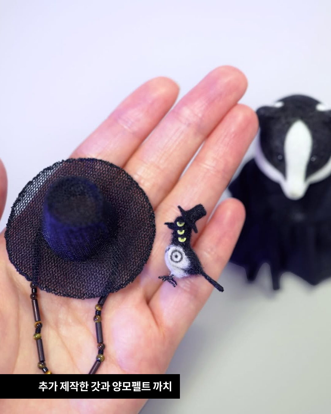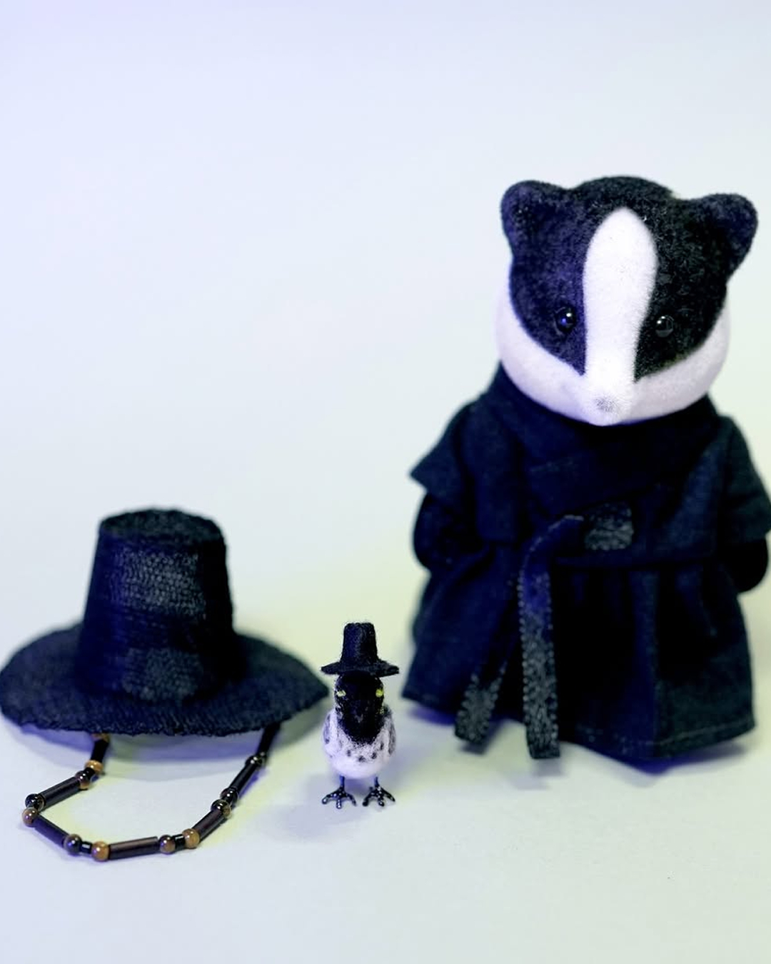 무서움 제로. 그저 귀여운 저승사자 진우 실바니안은 오소리 실바니안이 주인공입니다. 의상은 일반 면 원단으로 한복(철릭)과 갓을 만들었다고 해요. 양모펠트로 제작한 두 발로 서있는 까치는 작지만 디테일이 상당합니다. 금손의 커스텀을 보니 집에 누워 있는 실바니안의 이중생활을 본 것 같네요..