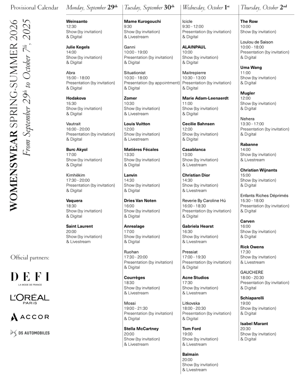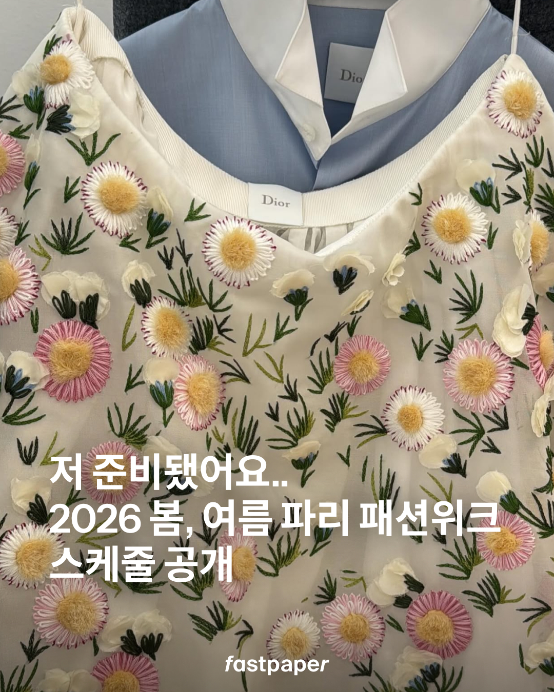 2026년 봄, 여름 파리 패션위크 일정이 공개되었습니다. 이번 파리 패션위크는 9월 29일부터 10월 7일까지, 총 76개의 쇼와 36개의 프레젠테이션이 예정돼 있죠. 이번 시즌은 샤넬, 발렌시아가, 로에베, 뮈글러, 장 폴 고티에 등 다수 브랜드들이 새로운 크리에이티브 디렉터의 데뷔 컬렉션을 선보여 많은 변화가 기대됩니다.