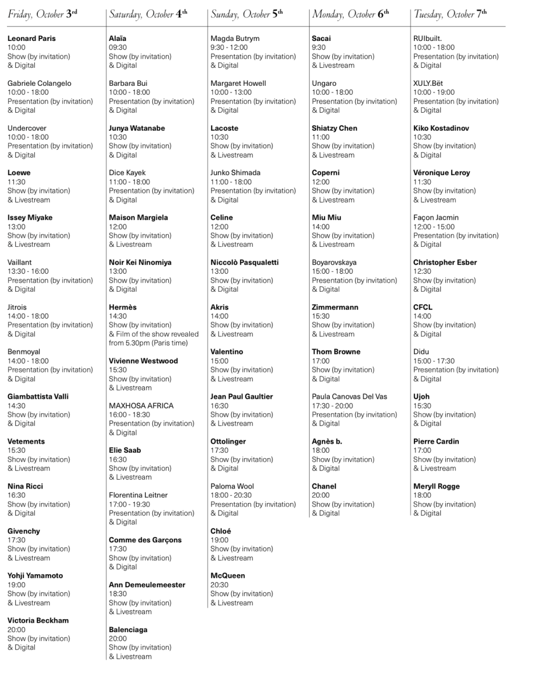 또한 캘린더에 복귀하는 브랜드로 셀린느가 있으며 마르니의 새 수장으로 발탁된 메릴 로게가 이번 시즌의 피날레를 장식하게 됩니다. 자세한 일정을 슬라이드를 참고하세요.