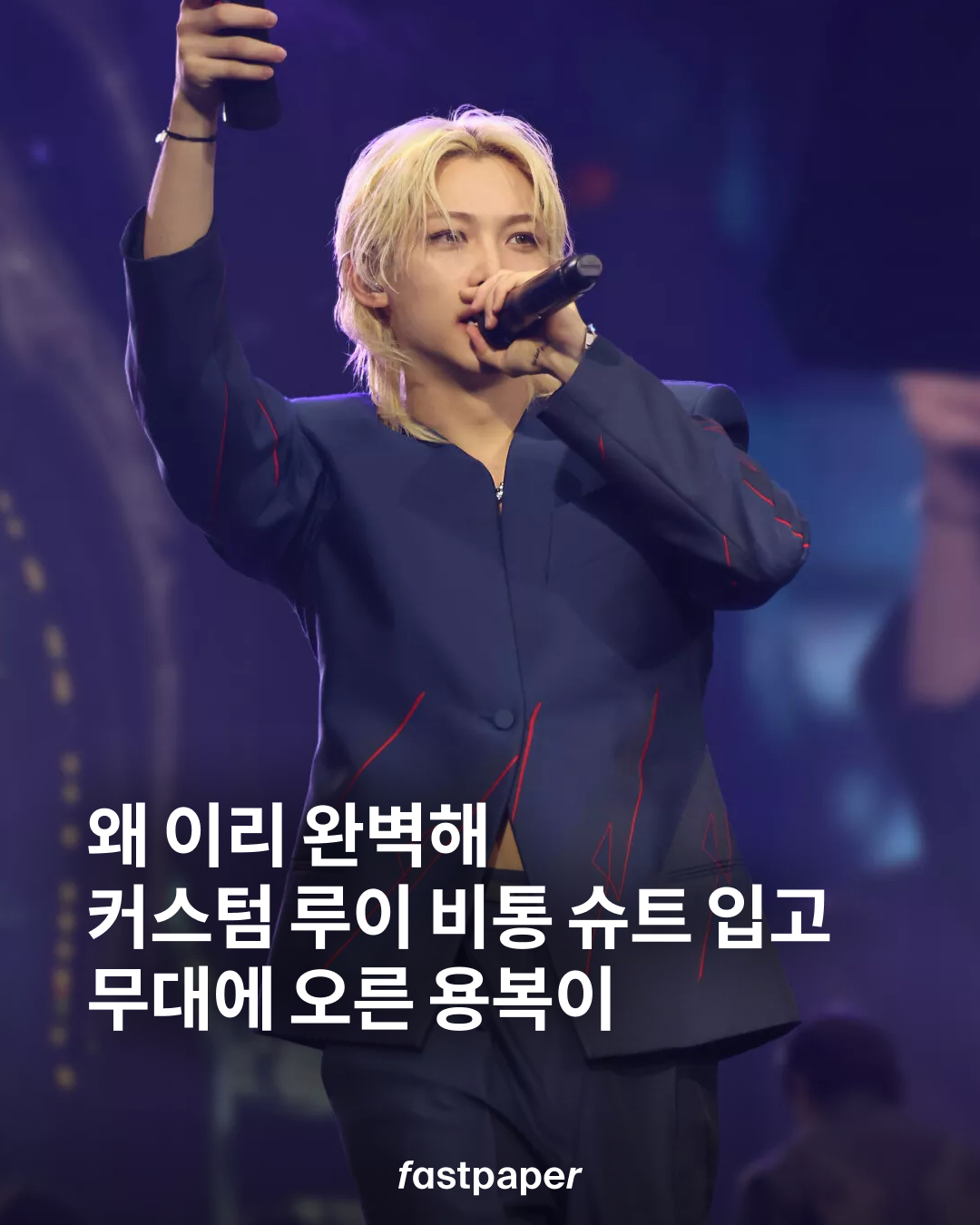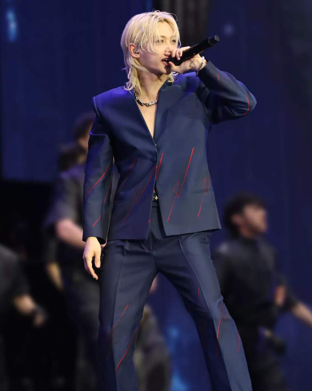 그중 눈길을 끈 건 바로 필릭스의 무대 의상. 필릭스는 루이 비통의 크리에이티브 디렉터 니콜라 게스키에르가 제작한 커스텀 슈트로, 네이비 블루 자카드 실크 브이넥 버튼 재킷과 플레어 팬츠, 그리고 LV 프레스티지 목걸이로 스타일링을 완성했죠.
