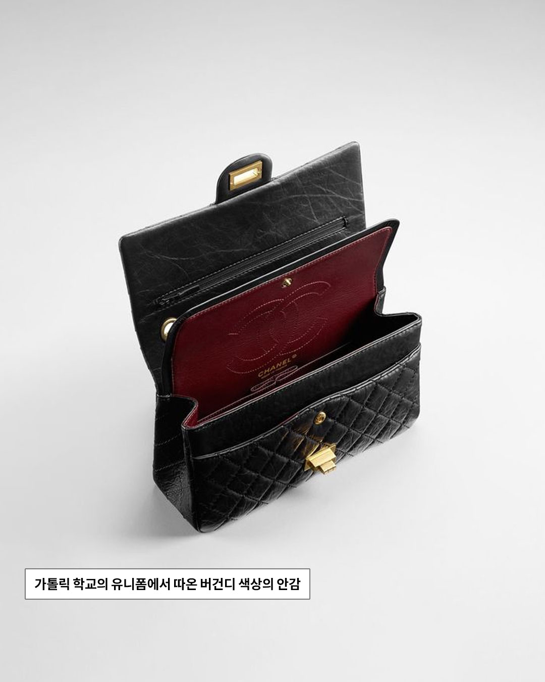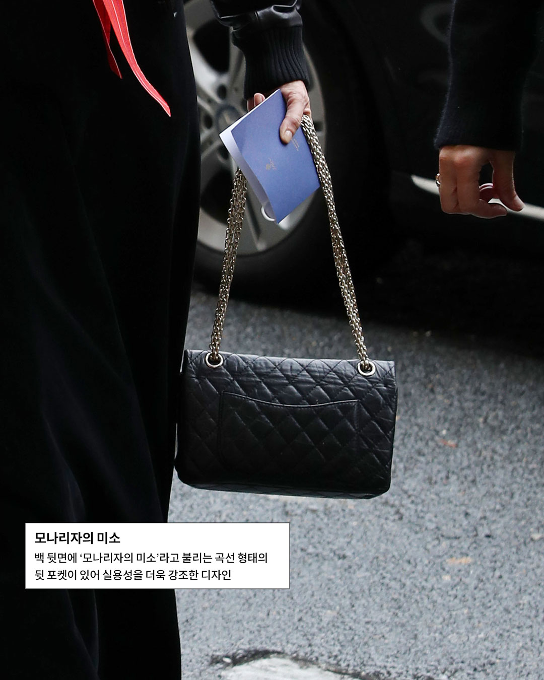 코코 샤넬이 어린 시절 자주 접했던 승마에서 영감받은 퀼팅 디테일, 가톨릭 학교의 유니폼에서 따온 버건디 색상의 안감, 그리고 샤넬이 직접 설계한 직사각형 잠금장치인 ‘마드모아젤 락’이 활용됩니다. 백 뒷면에 ‘모나리자의 미소’라는 별칭이 붙은 포켓 또한 상징적인 디테일이죠.