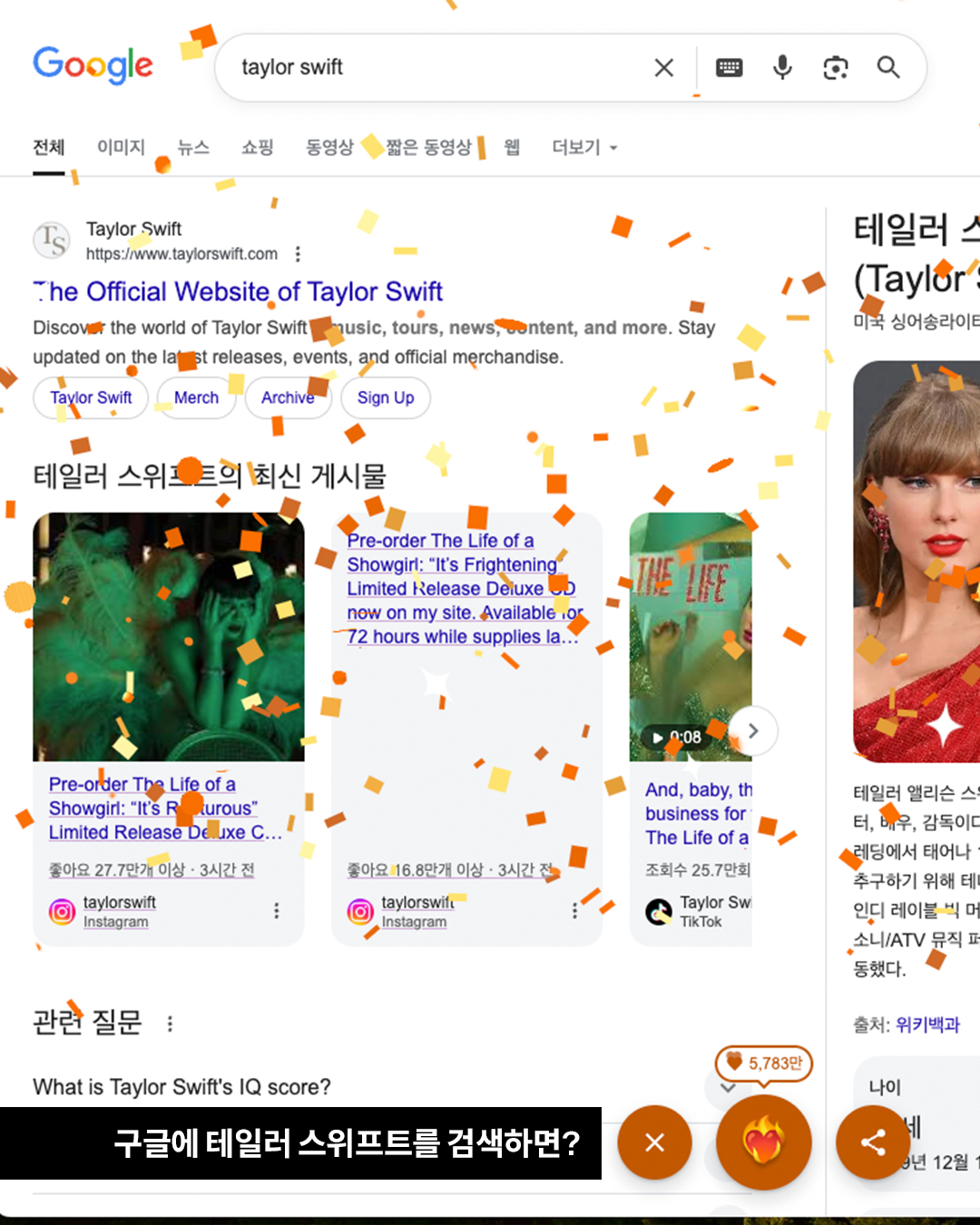 피드를 내려도 내려도 오렌지 글리터가 보이나요? 온갖 브랜드들이 합심한 듯 오렌지 글리터 콘텐츠를 올리는 이유는 바로 테일러 스위프트 때문입니다.