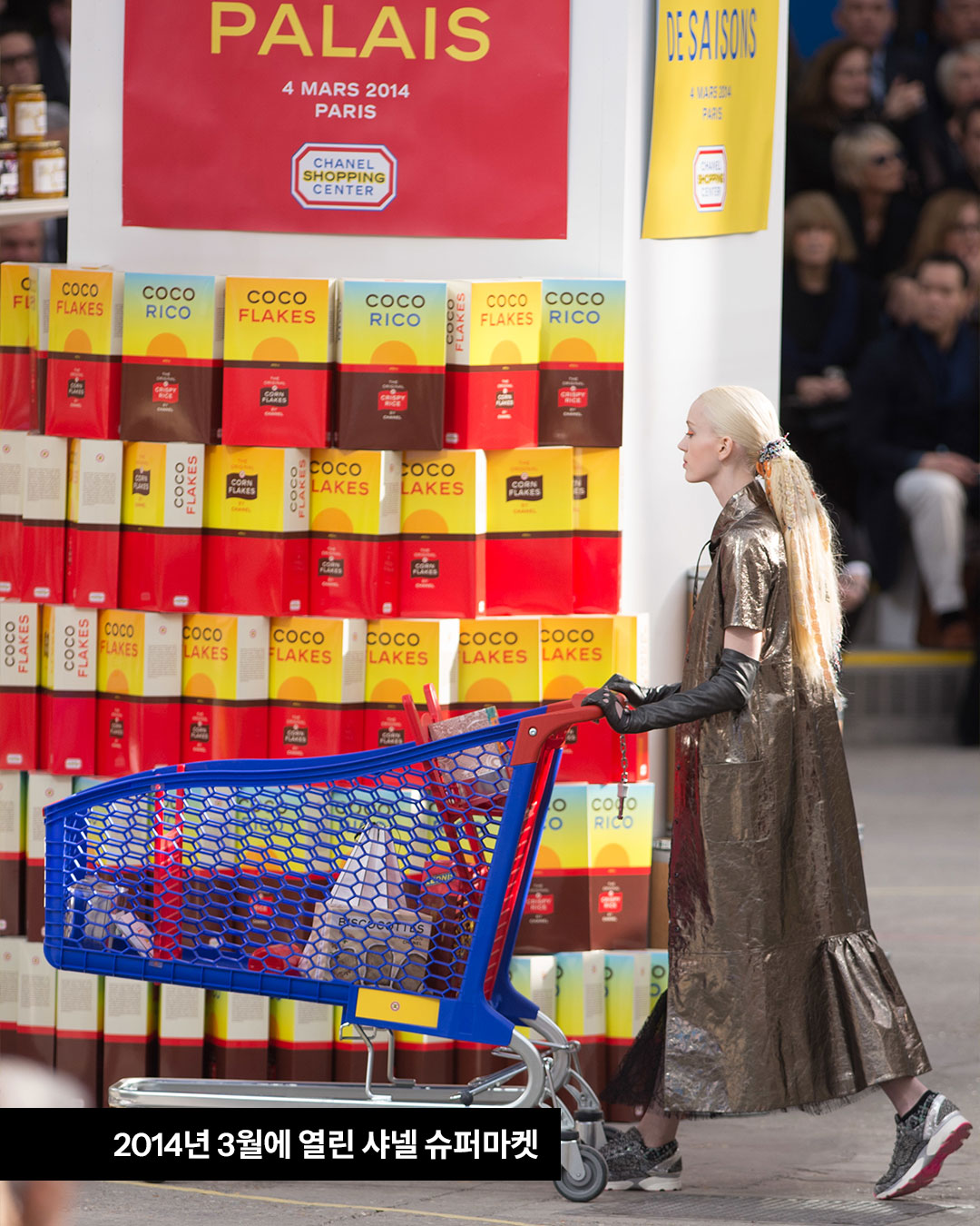 2014년 3월, 파리 그랑플레에서 열린 ‘샤넬 쇼핑 센터’는 2014 가을, 겨울 시즌을 선보이는 런웨이였습니다. 슈퍼마트를 무대로 한 칼 라거펠트의 컬렉션에는 컬러풀한 트위드 셋업, 레이스업 부츠, 그리고 런웨이 테마와 어우러지는 장바구니 핸드백과 쇼핑백 등으로 구성됐죠.
