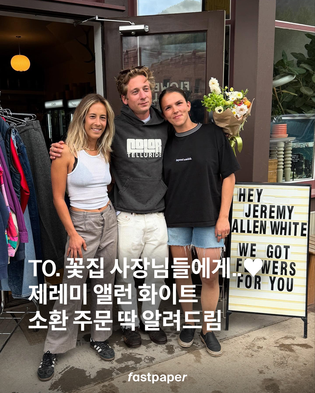 제레미 앨런 화이트랑 나란히 사진 찍고, 입꼬리가 내려갈 줄 모르는 @flowersbyellatelluride 사장님들.. 현 시각 에디터가 가장 부러운 사람 1위에 등극하셨어요. 제레미가 언젠가 한국 꽃집에도 놀러 오는 그날까지.. @전국의꽃집사장님들 우리 제레미 좀 소환 부탁드려요!