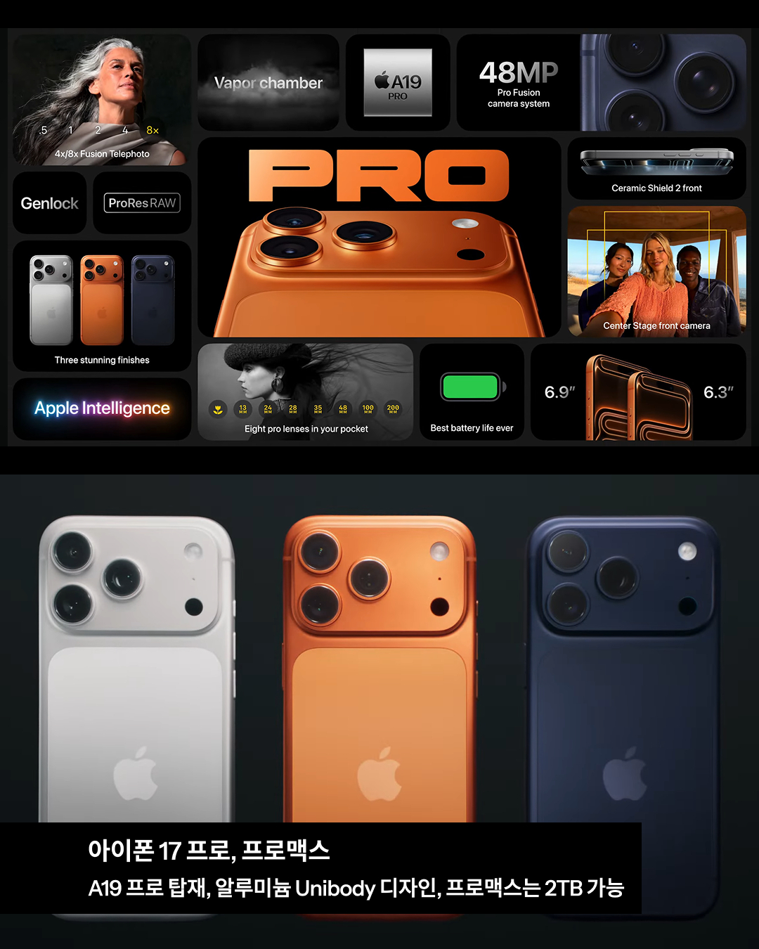 새로운 라인업은 아이폰 17 라인부터 아이폰 에어, 웨어러블 라인으로 구성됐습니다. 특히 5.6mm 두께의 에어 모델은 애플 역사상 가장 얇은 아이폰으로, ‘손에 쥔 유리 조각’ 같은 미니멀한 디자인을 선보였죠. 프로 라인업은 A19 프로 칩, 더 밝아진 OLED 디스플레이, 새롭게 디자인된 카메라 바를 탑재하며 성능과 디테일을 모두 끌어올렸습니다.