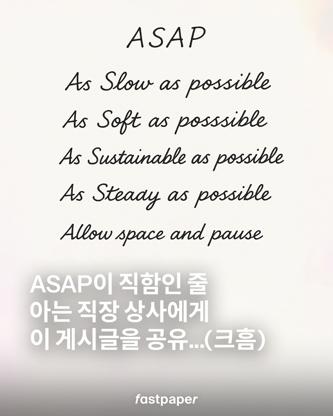주변 풍경도 감상하고, 느긋하고 또 천천히 살고 싶은데… 이 세상은 왜 이토록 빠르게 빠르게만 돌아갈까요? 하루에도 몇 번씩 무심코 내뱉는 단어, ASAP. 원래는 ‘가능한 한 빨리’라는 뜻의 요청이죠. 그런데 요즘은 이 ASAP가 조금 다른 결로 읽히기 시작했습니다.