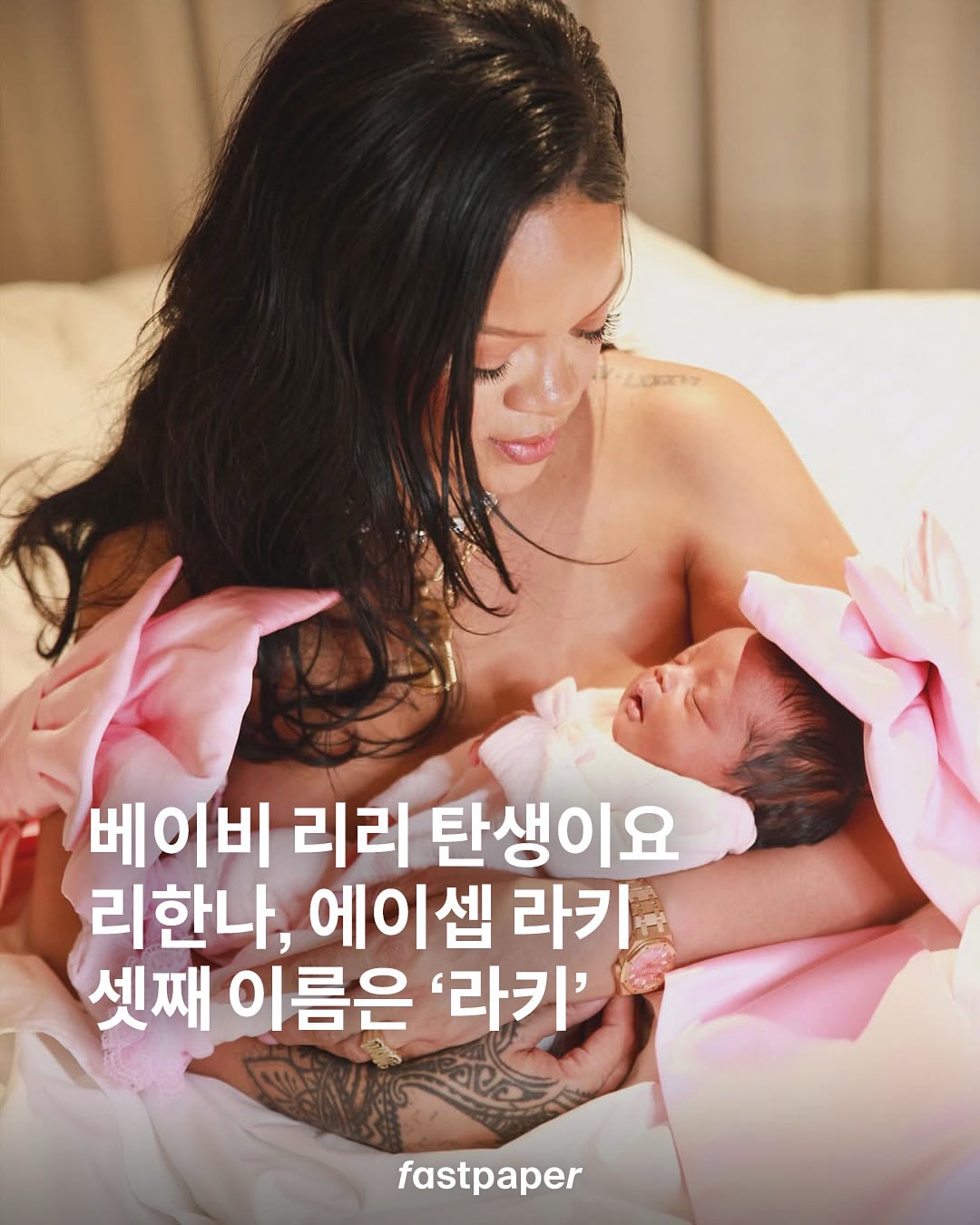 리한나, 에이셉 라키 셋째야, 세상에 나온 걸 축하해 태어나보니 엄마가 리한나, 아빠가 에이셉 라키. 2025년 9월 13일에 탄생한 아기 이름은 ‘라키 아이리시 메이어스(Rocki Irish Mayers)’라고 합니다.
