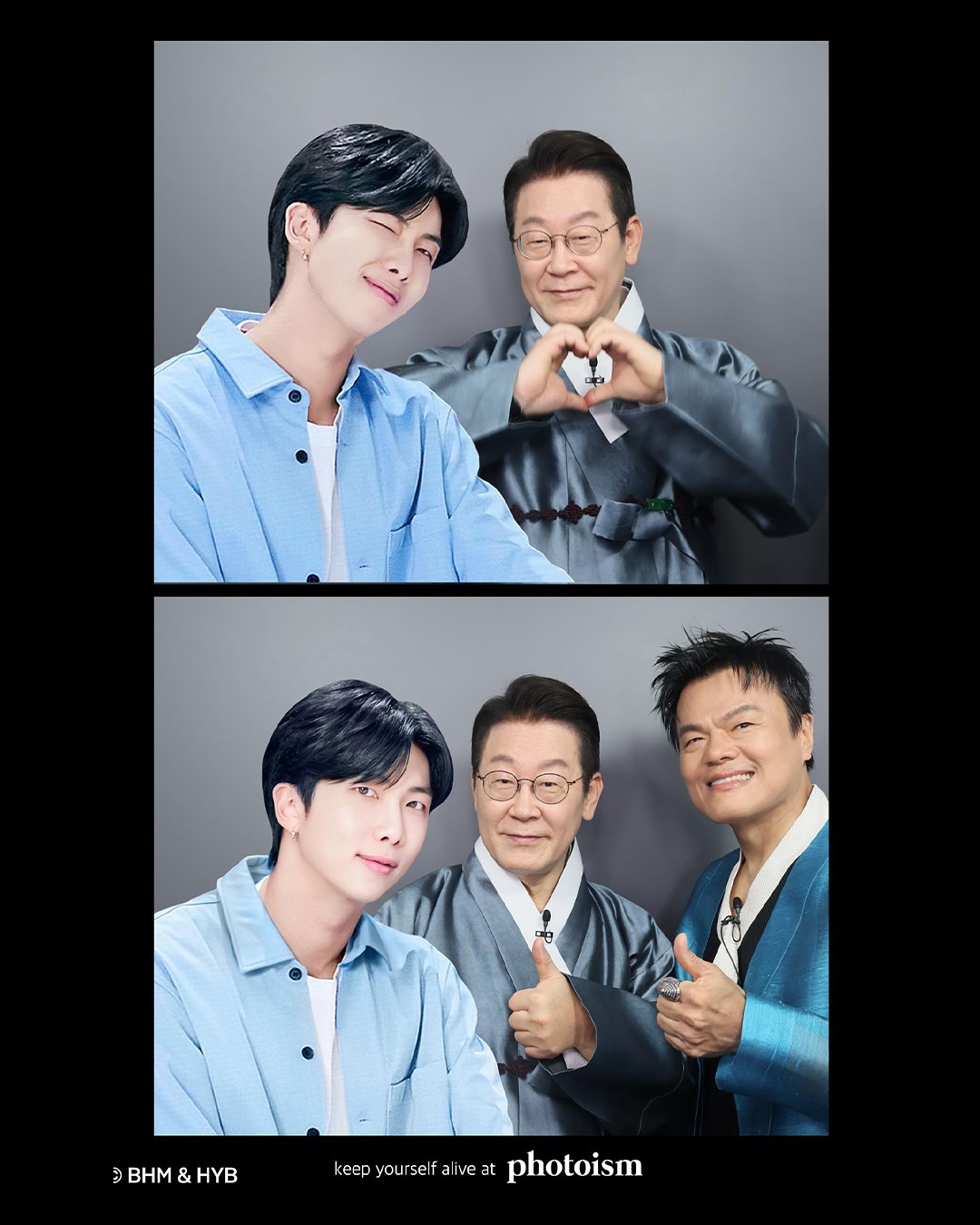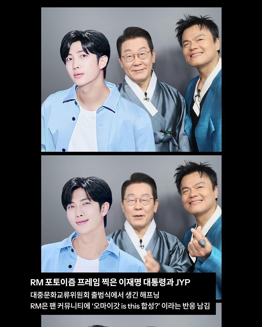 박진영 JYP엔터테인먼트 총괄 프로듀서가 이끄는 대통령 직속 대중문화교류위원회 출범식이 열렸습니다. 이 대통령은 박진영 공동위원장과 함께 ‘K-컬처 체험 공간’을 둘러보던 중 RM 프레임 포토이즘을 촬영했습니다.