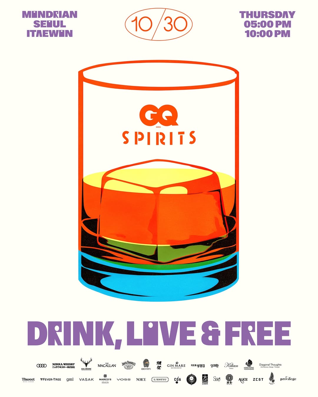 10월 30일 단 하루, GQ KOREA가 주최하는 제1회 ’지큐 스피릿‘이 몬드리안 서울 이태원에서 펼쳐집니다. 바 신을 사랑하고 스피릿을 깊이 탐구하고자 하는 애호가들을 위한 행사로 위스키, 진, 니혼슈, 데킬라 등 15종의 F&B 브랜드와 아시아 최정상 바 9곳이 함께합니다. 초청된 분들만 입장할 수 있으며, 일부 한정 수량은 얼리 버드 기간에 캐치테이블을 통해 구입 가능합니다.