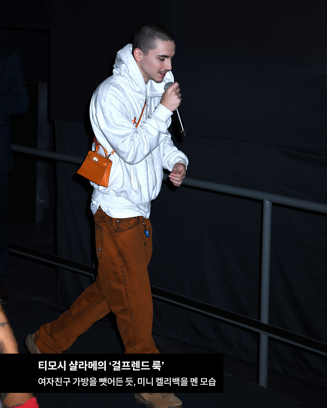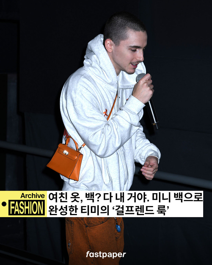 팬들 사이에서는 이 가방이 여자친구 카일리 제너의 소장품일 것이라는 추측이 나오고 있습니다. 마치 연인의 옷장에서 아이템을 꺼내 착용한 듯한 티미의 ‘걸프렌드 룩’, 나쁘지 않네요. 이날 티모시는 오버사이즈 후드 집업에 오렌지 톤의 데님 팬츠로 룩을 완성했습니다.