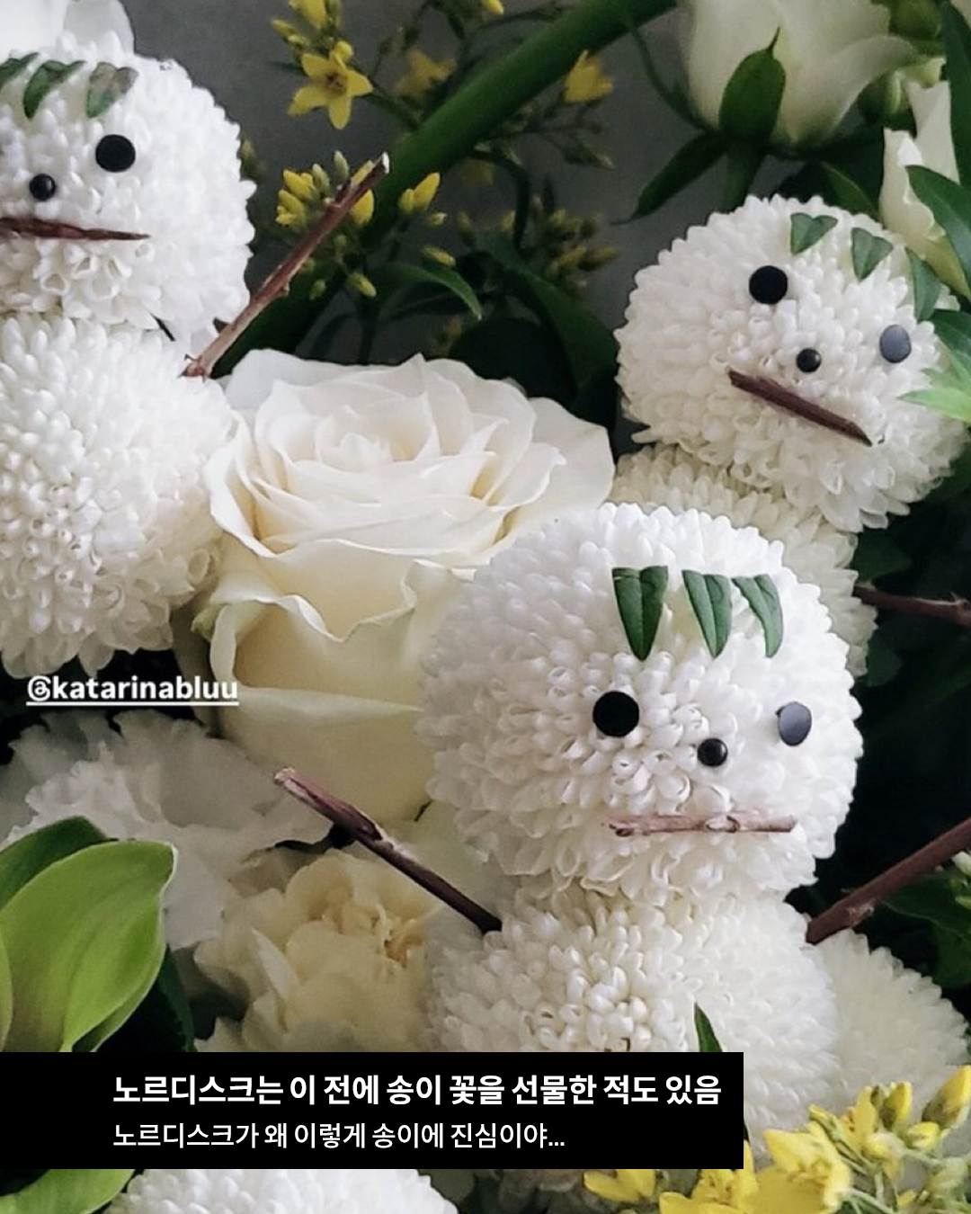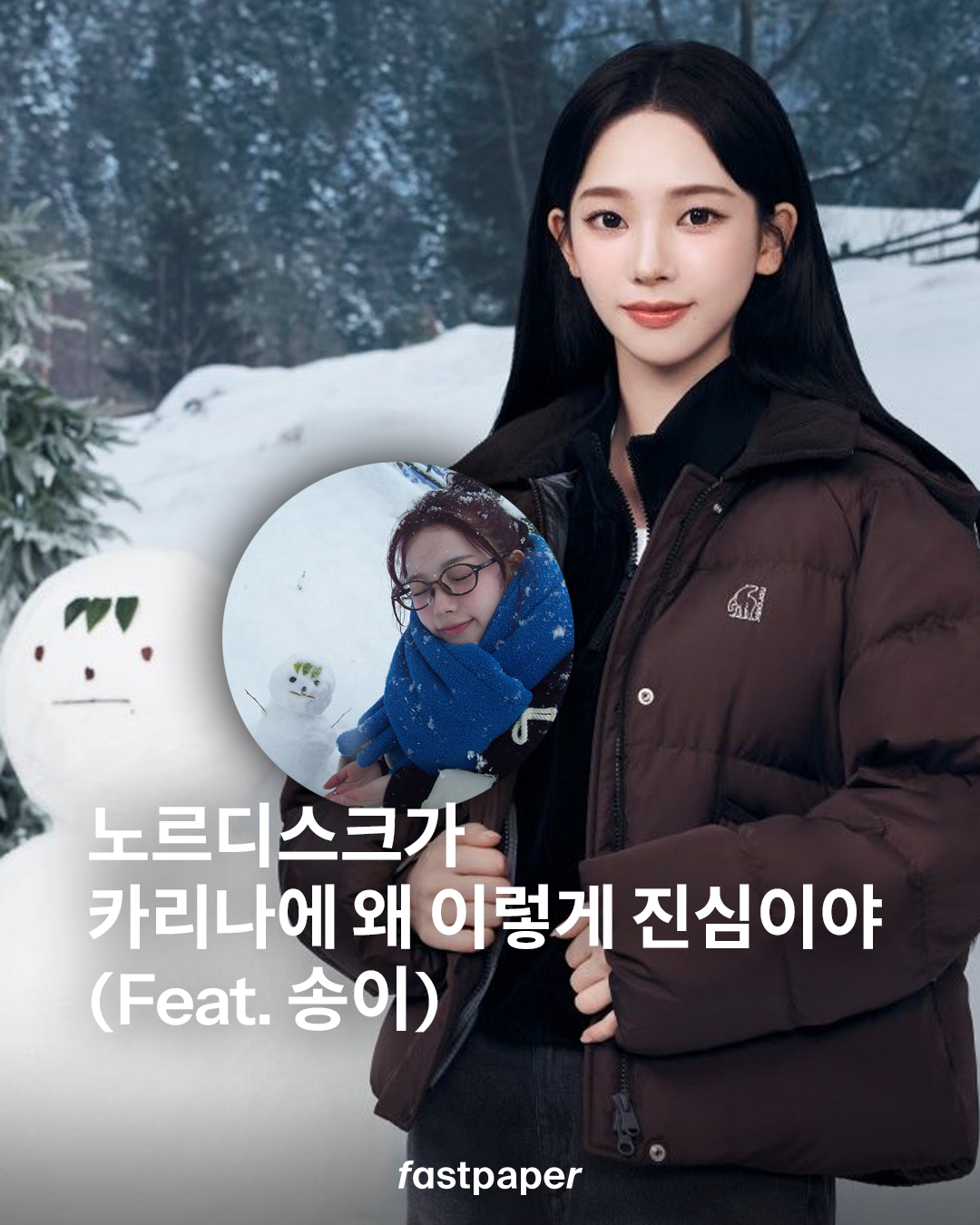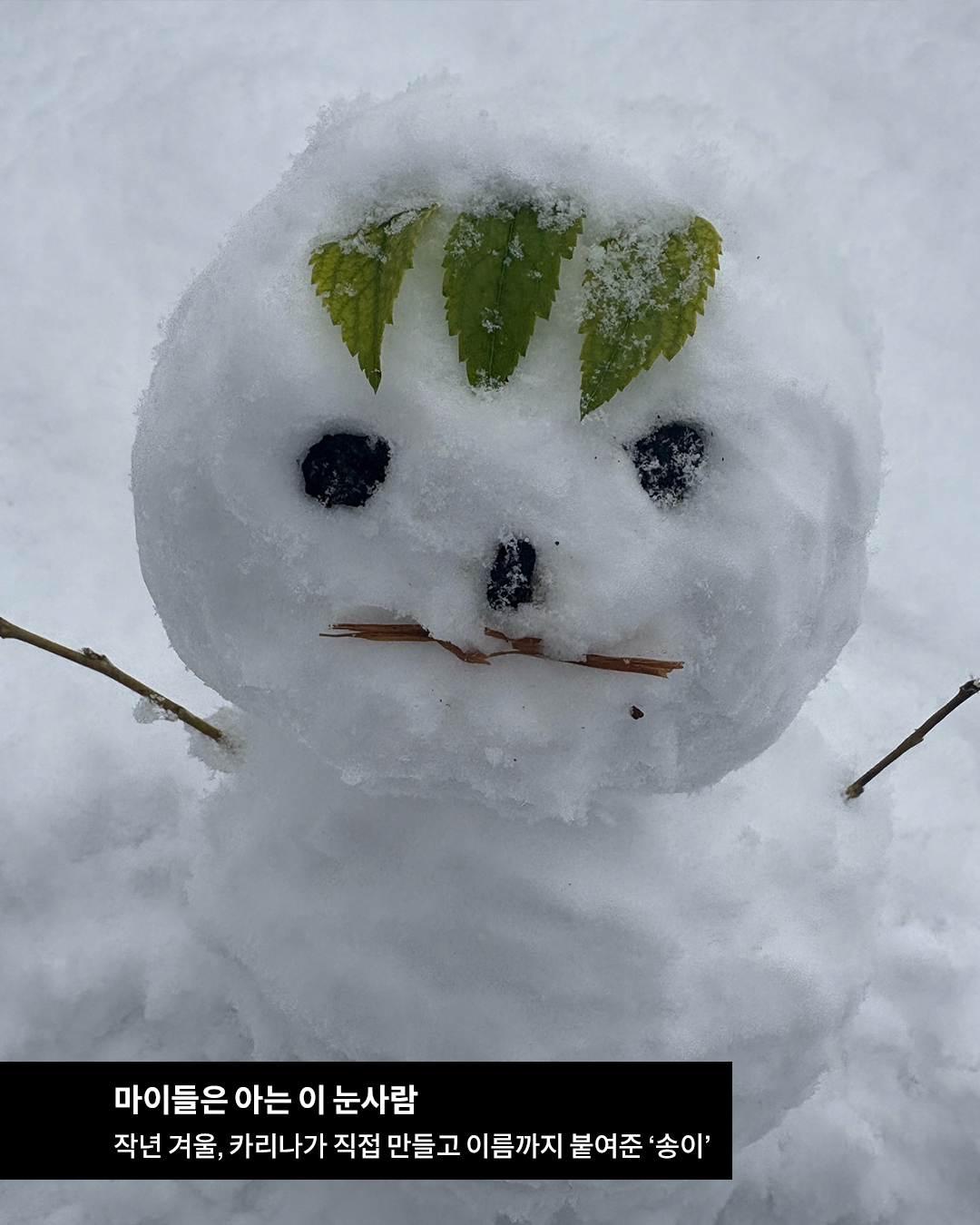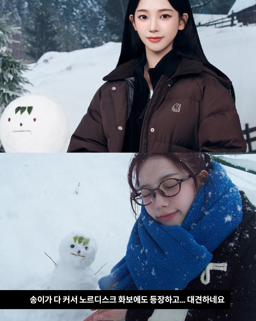 노르디스크가 새롭게 공개한 캠페인 이미지 속 눈사람을 주목하세요. 그냥 눈사람 아니야?라고 하신다면 노르디스크 섭섭해요~ 나뭇잎 앞머리에 입 밑에 위치한 점까지, 왜인지 카리나를 닮은 것 같은 이 눈사람은 작년 겨울 카리나가 직접 만들고 이름까지 붙여준 ‘송이’죠.