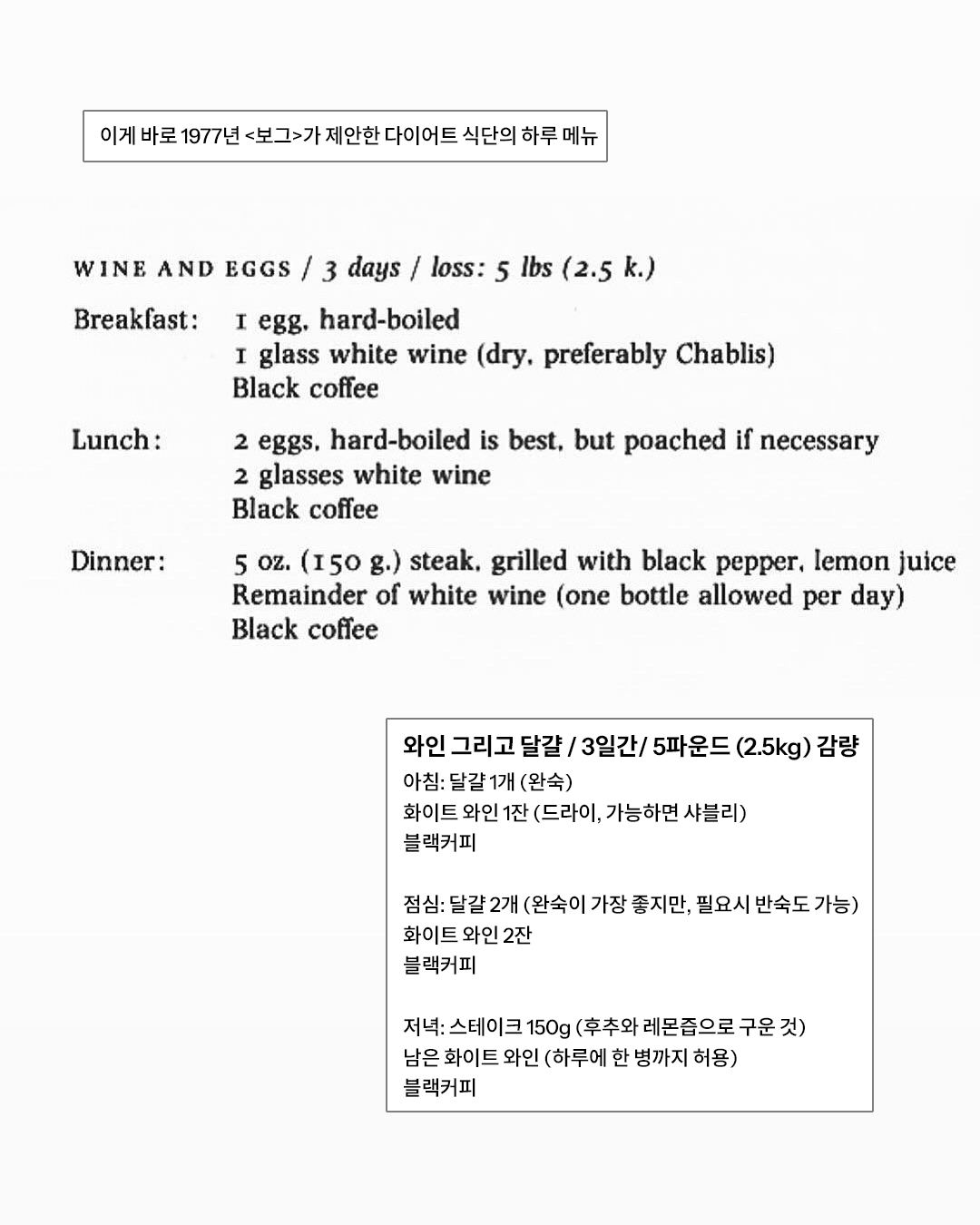 3일 만에 약 2.2kg 감량이 가능하다고 주장했던 이 식단, 구성은 단순한데요. 달걀, 와인과 블랙커피. 그리고 단 한 끼 허락된 저녁에만 주어지는 달콤한 스테이크 150g.
