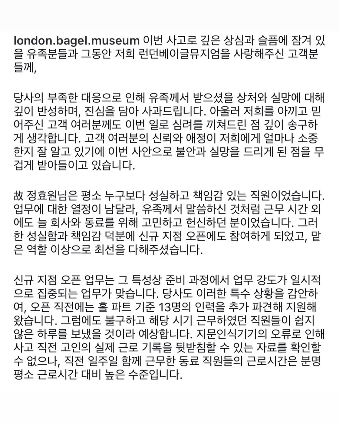 런던베이글뮤지엄에서 근무하던 20대 故 정효원 직원이 숨진 채 발견된 사건과 관련해, 유족이 과로사를 주장하며 진상 규명을 촉구하자 런던베이글뮤지엄 측이 공식 입장을 내놨습니다.