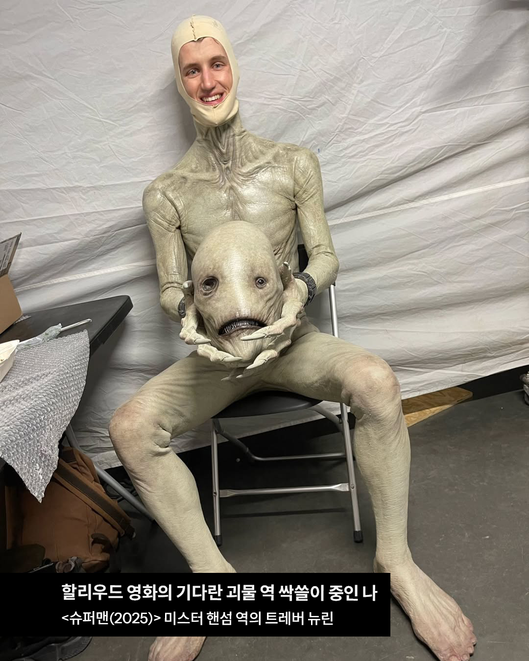 트레버 뉴린은 매일 매일이 핼러윈이다. 요즘 가장 핫한 할리우드 영화 속 괴생명체는 이 배우가 연기합니다. 배우 트레버 뉴린은 영화 <슈퍼맨(2025)>, <에일리언: 로물루스(2024)> 등에서 저세상 캐릭터들을 연기했는데요. 2M라는 큰 키와 무겁고 불편한 특수 분장을 견디는 인내력까지! 괴생명체 전문 배우로서 완벽한 조건을 갖추고 있습니다.