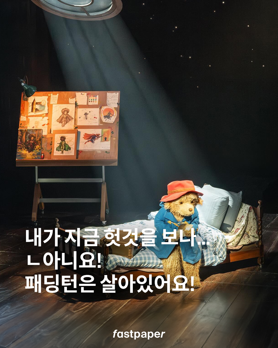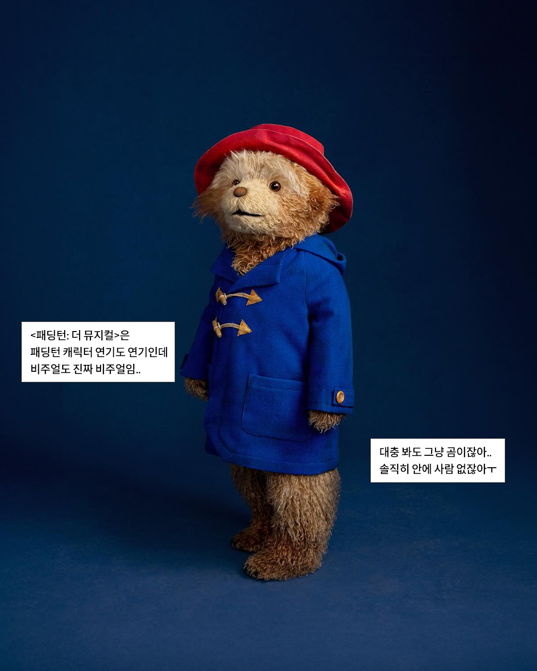 그런데 무대 위 패딩턴이 등장하자마자 객석은 웅성거렸죠.. “CG인가요? 사람인가요..? 진짜 곰인가요..?” 분명 ‘곰 인형탈’일 텐데, 보고 있으면 점점 더 혼란스러워지는 미친 싱크로율. 그 비밀은 사실 두 배우가 한 몸처럼 움직이는 ‘듀얼 연기 시스템’에 있었습니다.