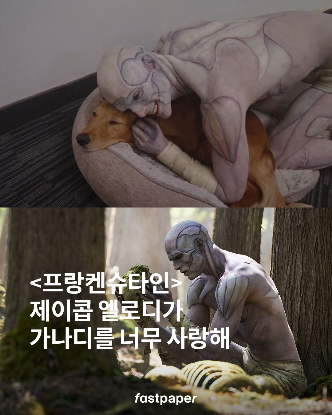 제이콥 엘로디는 이번 작품에서 ‘크리처’를 맡아 무려 10시간이 걸리는 분장 과정을 거쳐 평소와는 완전히 다른 캐릭터로 변신했는데요. 지미 팰런의 <투나잇 쇼>에 출연한 엘로디가 <프랑켄슈타인> 촬영장에서 반려견 레일라와 함께한 사진을 공개했습니다.