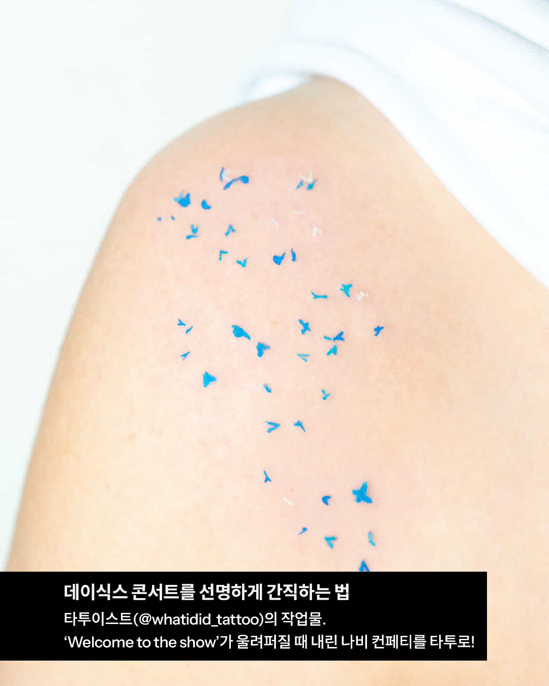 그 순간을 가장 선명하고 낭만적이게 간직할 타투이스트(@whatidid_tattoo)의 작업물. 데이식스 콘서트장에 다녀온 한 고객은, 머리 위로 떨어지던 나비 컨페티를 모티프로 삼아 어깨에 푸른 나비 타투를 새겼다고 하죠? 타투를 볼 때 마다 나비 컨페티가 떨어지던 ‘Welcome to the show’ 무대가 떠오를 것 같습니다. 최애의 얼굴을 새기는 것보다 더욱 낭만적이고 의미 있을 수도 있겠네요.