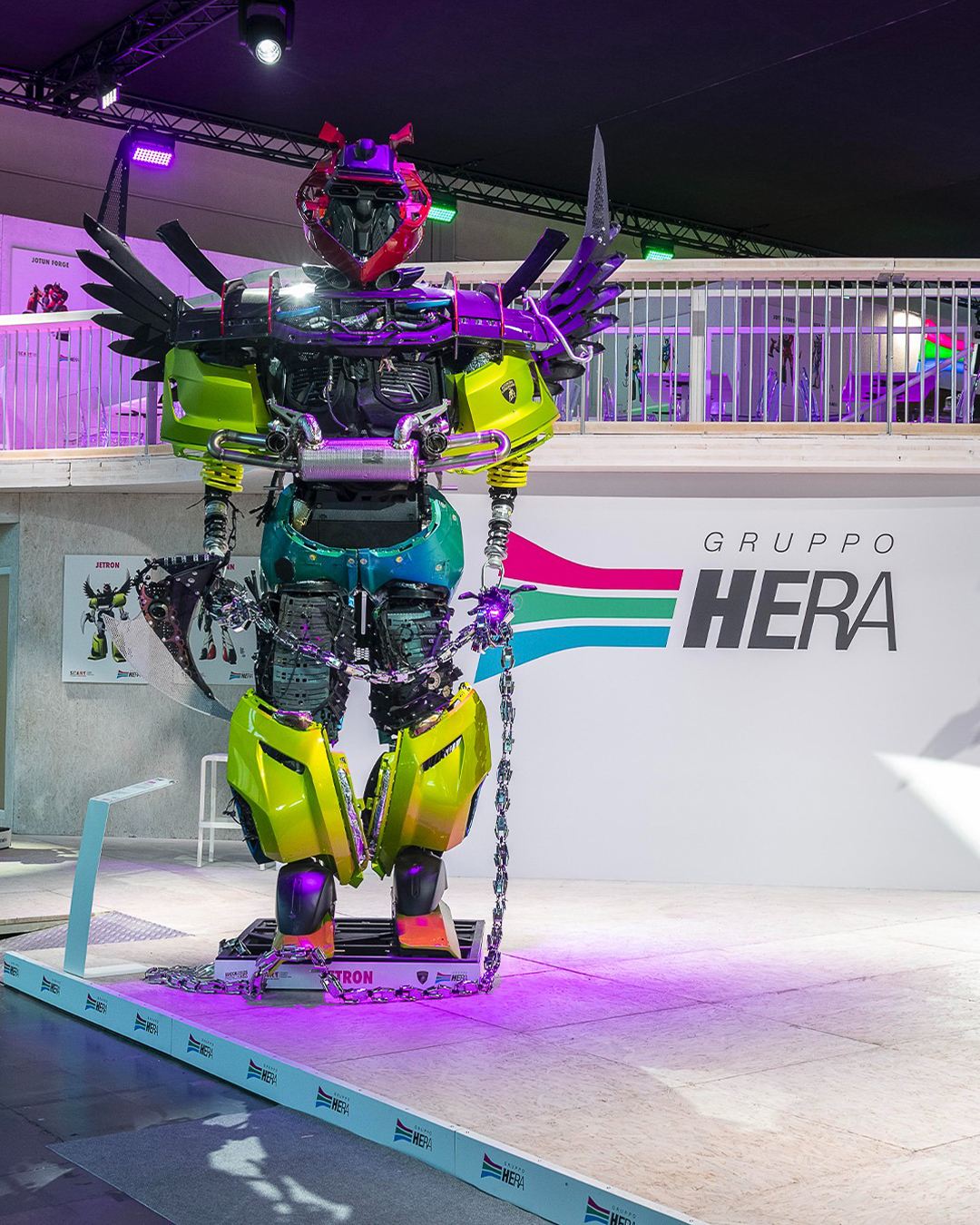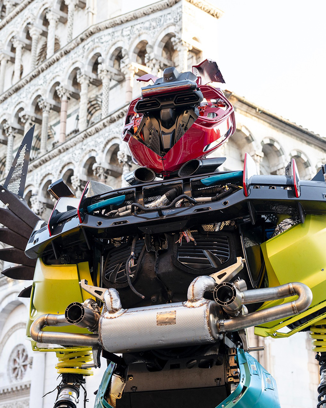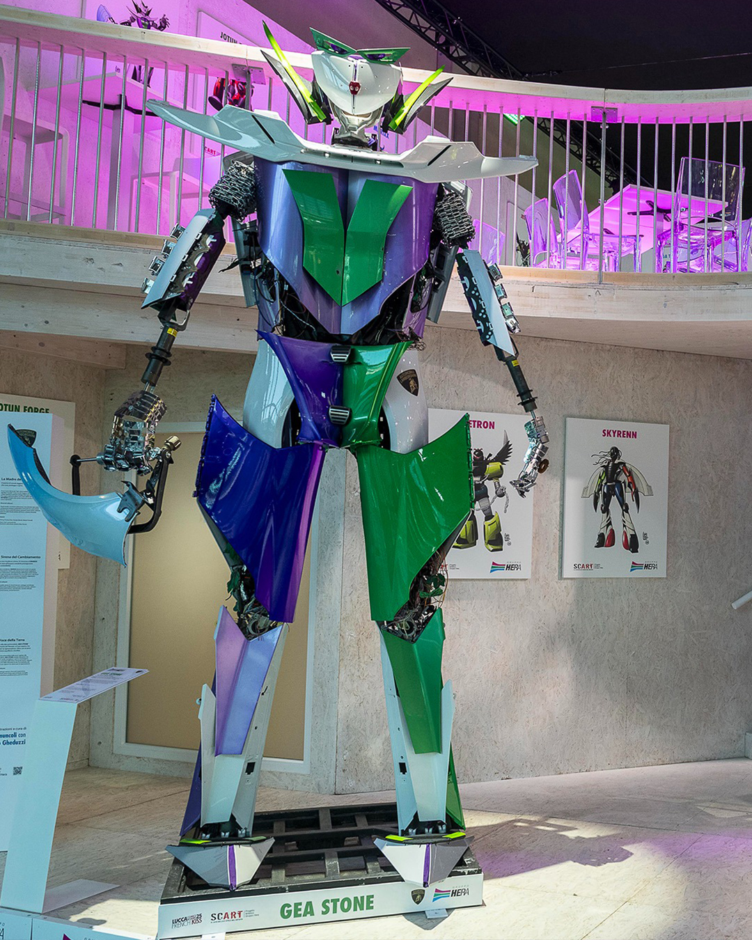 이번 프로젝트는 예술 재활용 연구소 @scart_line 과의 협업으로 탄생했어요. 람보르기니 산타가타 볼로냐 공장에서 나온 후드, 범퍼, 시트, 스포일러, 카본 파츠들이 모두 해체되어 로봇의 몸체로 재탄생했죠. 디자인은 <어메이징 스파이더맨>의 일러스트레이터로 잘 알려진, 이탈리아 출신 만화가 주세페 카문콜리 @giuseppe_camuncoli 가 맡았고. 조형과 제작은 SCART를 비롯 피렌체, 라벤나 미술 아카데미, 밀라노 공과대학 학생들이 함께 완성했습니다.