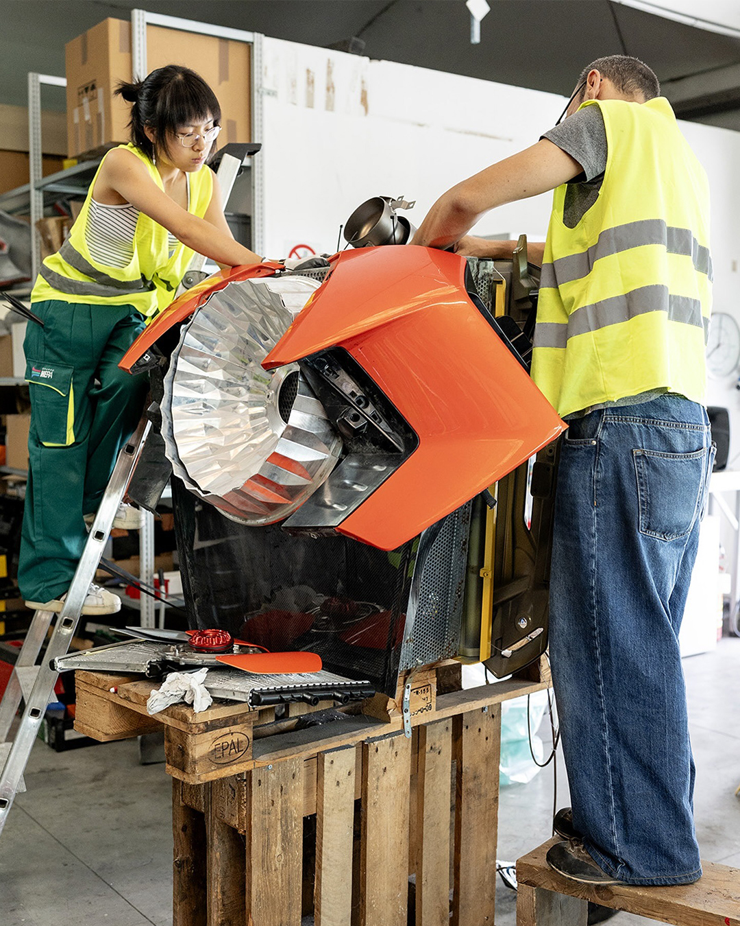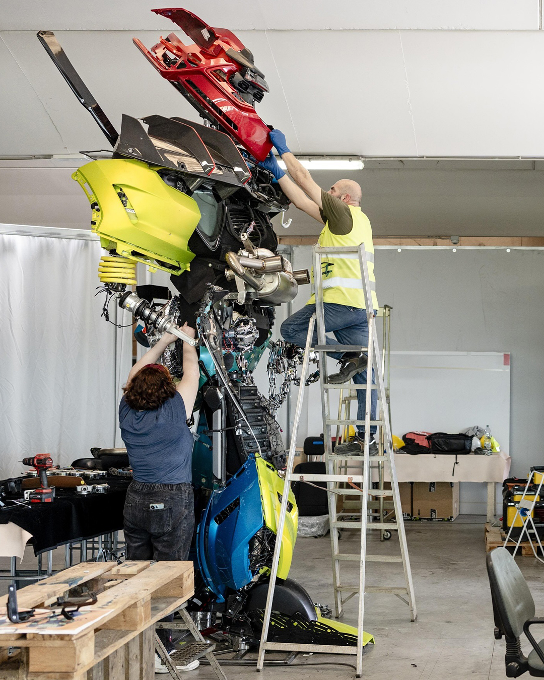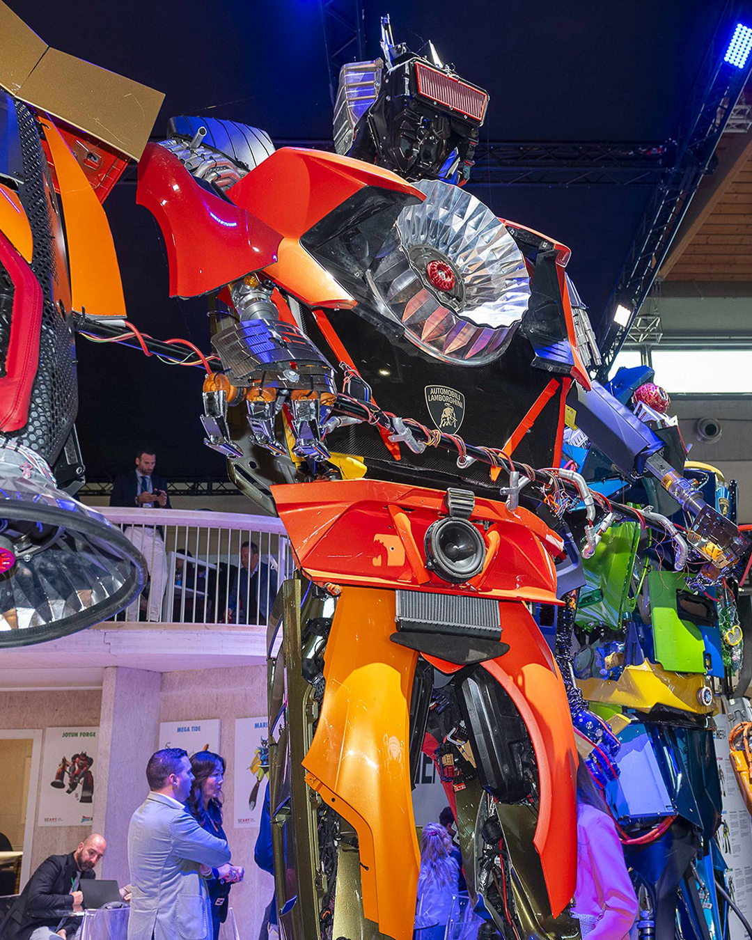 이번 프로젝트는 예술 재활용 연구소 @scart_line 과의 협업으로 탄생했어요. 람보르기니 산타가타 볼로냐 공장에서 나온 후드, 범퍼, 시트, 스포일러, 카본 파츠들이 모두 해체되어 로봇의 몸체로 재탄생했죠. 디자인은 <어메이징 스파이더맨>의 일러스트레이터로 잘 알려진, 이탈리아 출신 만화가 주세페 카문콜리 @giuseppe_camuncoli 가 맡았고. 조형과 제작은 SCART를 비롯 피렌체, 라벤나 미술 아카데미, 밀라노 공과대학 학생들이 함께 완성했습니다.