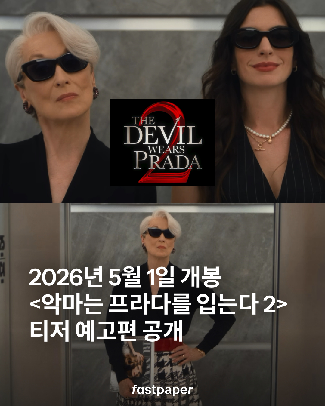 전 세계적으로 사랑받은 <악마는 프라다를 입는다 2>의 티저 영상이 공개됐습니다. 짧은 영상 속 미란다 역의 메릴 스트립과 앤디 역의 앤 해서웨이는 극중 매거진 ‘RUNWAY’ 엘리베이터에서 만나는 모습을 보여주죠. 앤 해서웨이 생일에 공개된 티저 예고편, BGM만 들어도 설레는 시즌 2입니다.