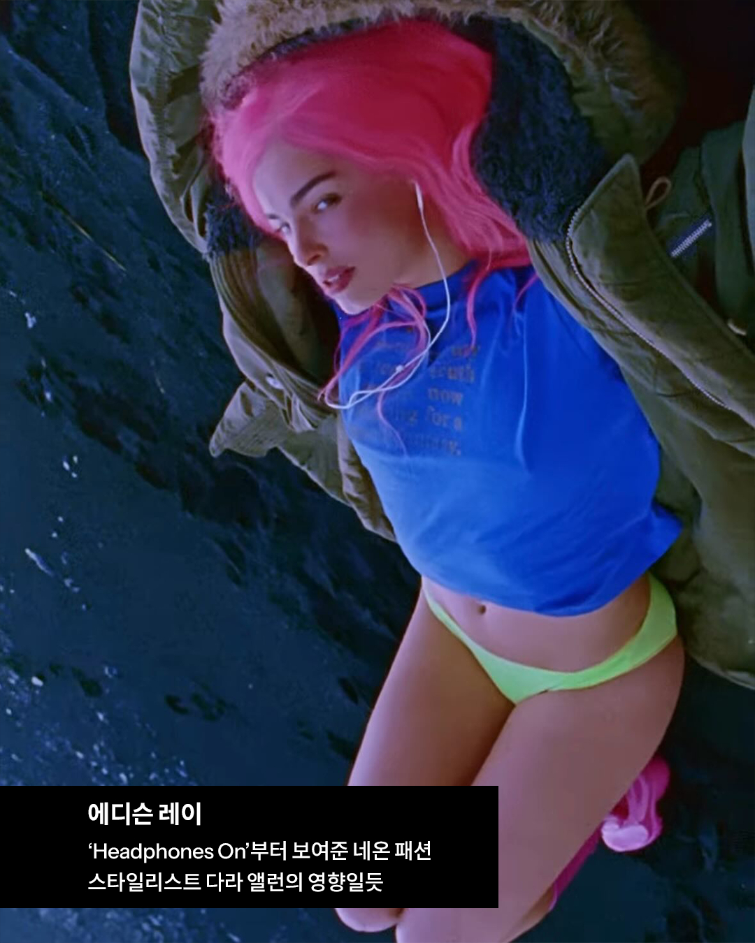 ‘Headphones On’ 뮤직비디오에서 네온 핑크색 머리로 등장한 에디슨 레이는 최근 열린 콘서트에서 댄서들과 함께 네온 패션 의상을 선보였습니다. 스타일리스트 다라 앨런(@dara._ )의 츼향이 반영된 걸로 보여요.