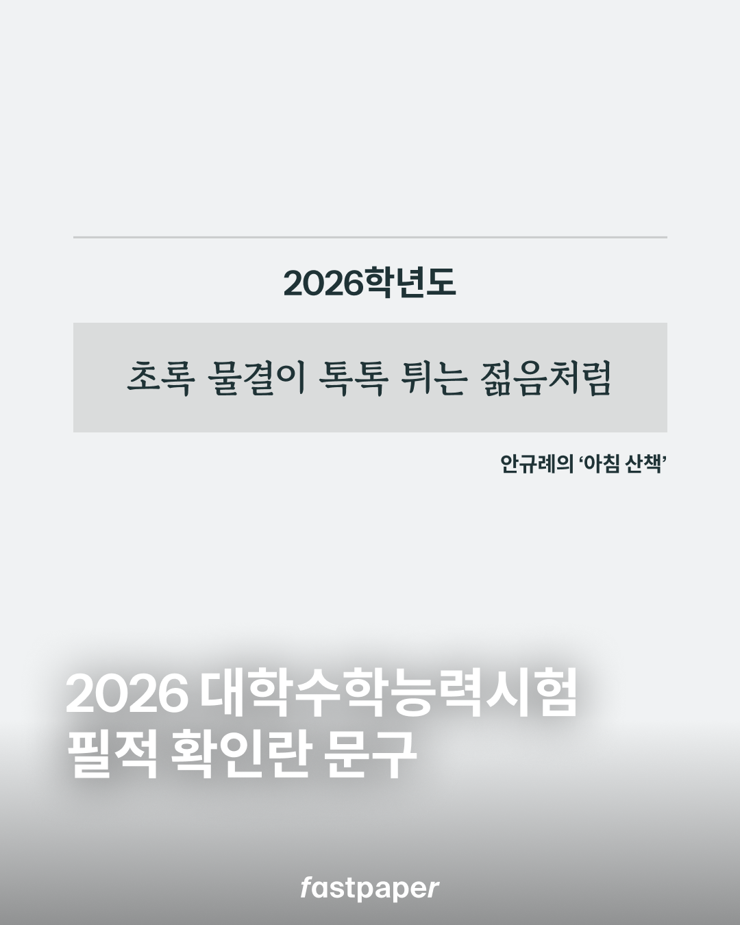 바로 ‘초록 물결이 톡톡 튀는 젊음처럼‘! 이는 안규례 시인의 ‘아침 산책’ 가운데 한 구절입니다. 수험생들의 미래가 빛나는 초록 물결로 가득하길 바랄게요…