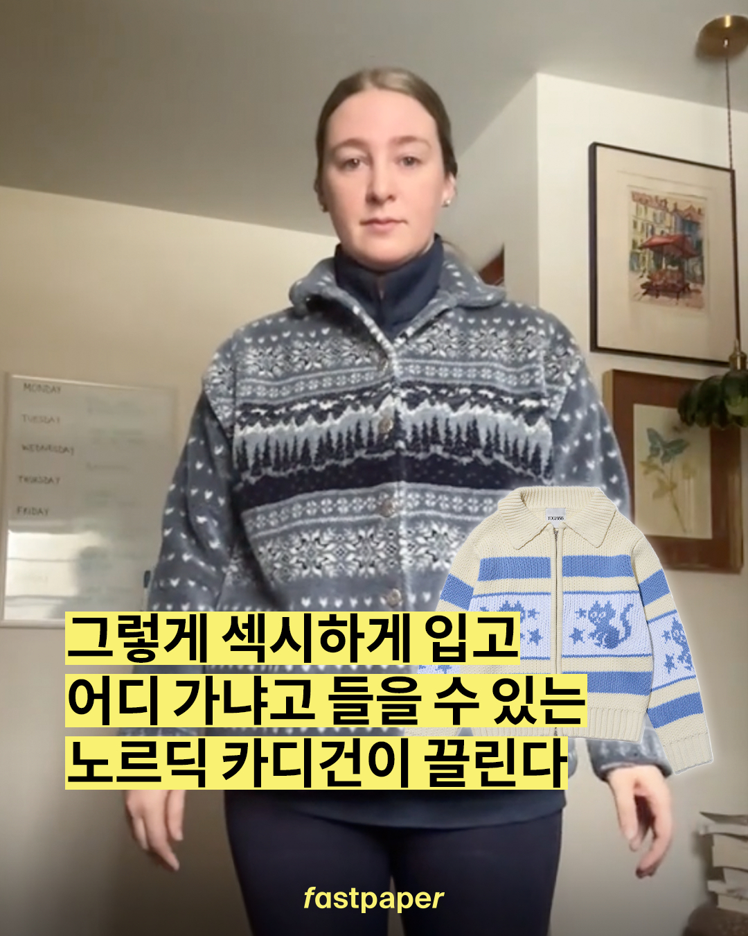 웃긴건 둘째 치고 이 언니 입은 게 엄청 따뜻해 보여서 저도 이런 카디건 하나 구매하고 싶어졌습니다. ‘노르딕 카디건’ 혹은 ‘코위찬 스웨터’로 검색하면 되는데요, 요즘엔 곰돌이, 고양이 캐릭터가 들어가 귀엽고 영한 느낌으로도 출시되더라고요.