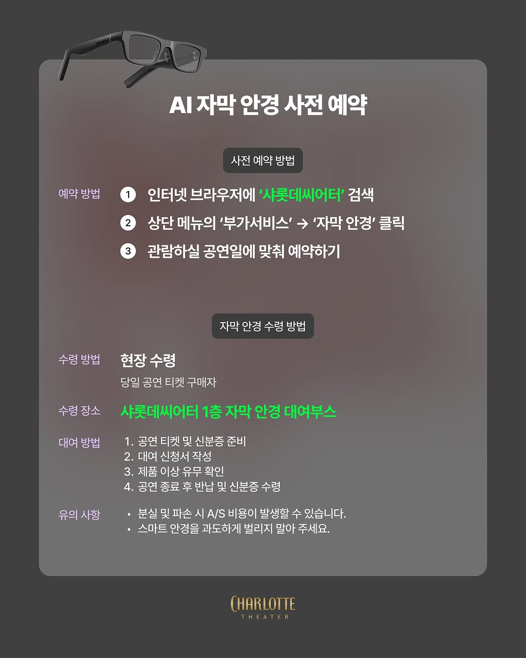 샤롯데씨어터가 ‘AI 자막안경’ 서비스를 시작합니다. 이는 국내 대극장 중 처음으로 자막안경 대여 서비스를 공식 도입하는 것으로, 관객이 안경을 착용하면 공연의 대사가 실시간으로 렌즈 위에 나타나는 방식이죠. 해당 기술을 통해 외국인과 청각장애인도 뮤지컬 공연에 몰입할 수 있을 예정.