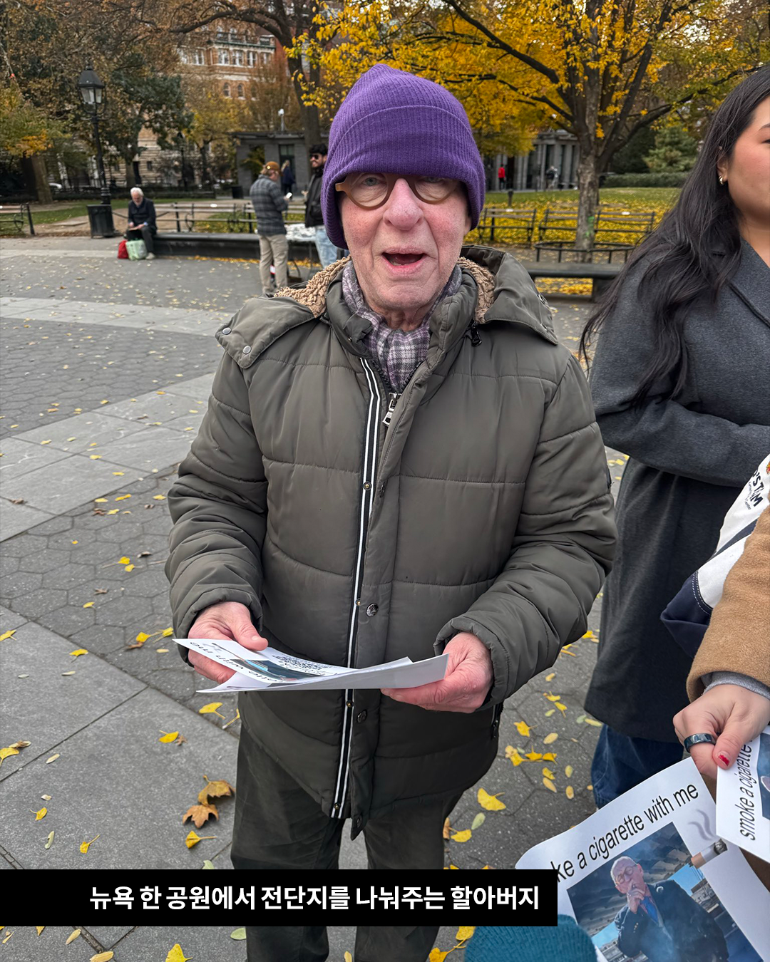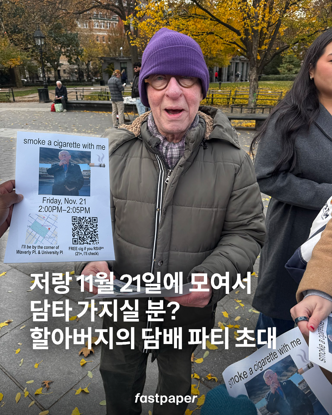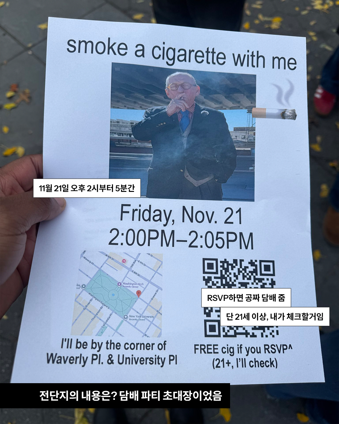 뉴욕의 한 공원에서 전단지를 나눠주는 할아버지. 무슨 내용인고 하니 담배 파티 초대장이었습니다. 이 담배 파티는 11월 21일 오후 2시에서 2시 5분까지 진행되며