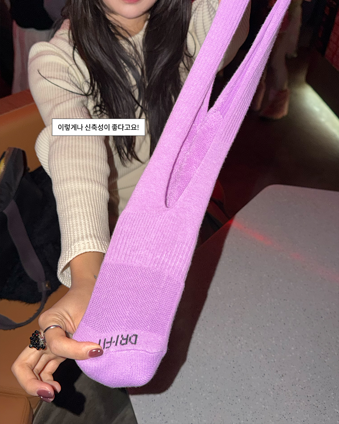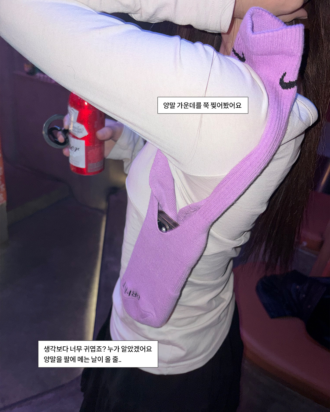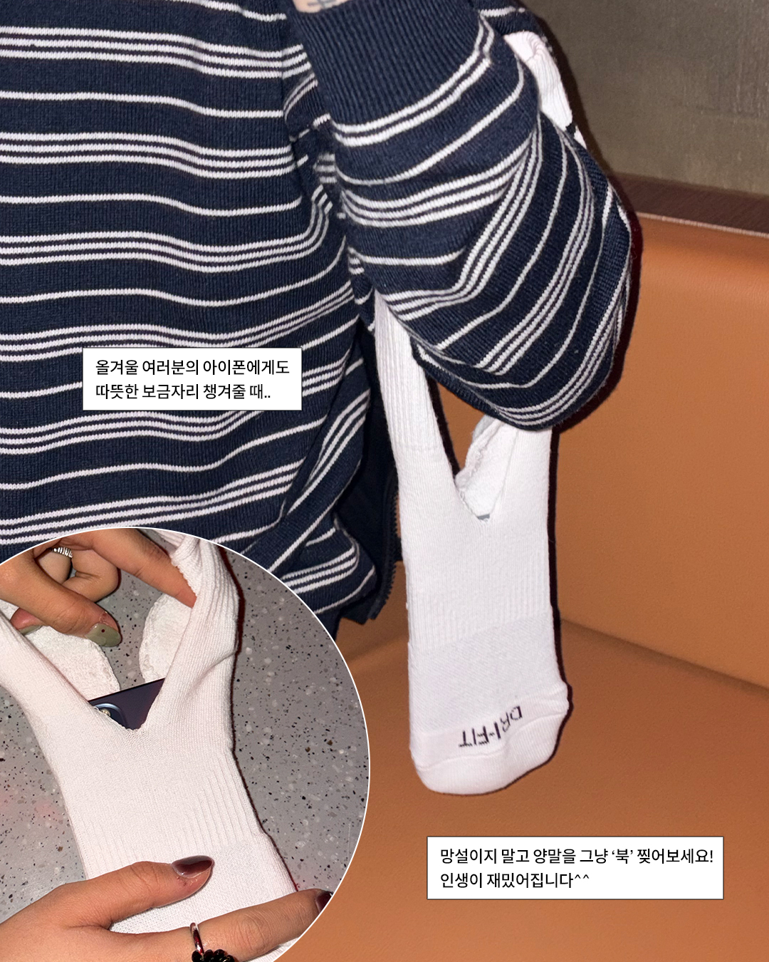만드는 법은 간단해요. 망설임 없이, 양말 가운데를 시원하게 쭉— 찢으면 되죠. 그럼 초간단하게 평범한 양말이 아이폰 포켓으로 변신! 누가 알았겠어요, 양말을 팔에 메고… 또 가방에 달고 다니는 날이 올 줄. (그런데 막상 써보면 귀엽고 은근 편해서 계속 찾게 된다는..)